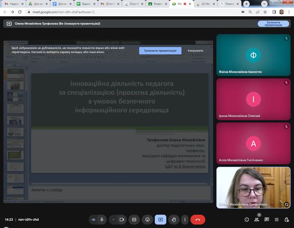 Інноваційна діяльність педагога за спеціалізацією (проєктна діяльність) в умовах безпечного освітнього середовища (д.пед.н., проф. О.М.Трифонова);