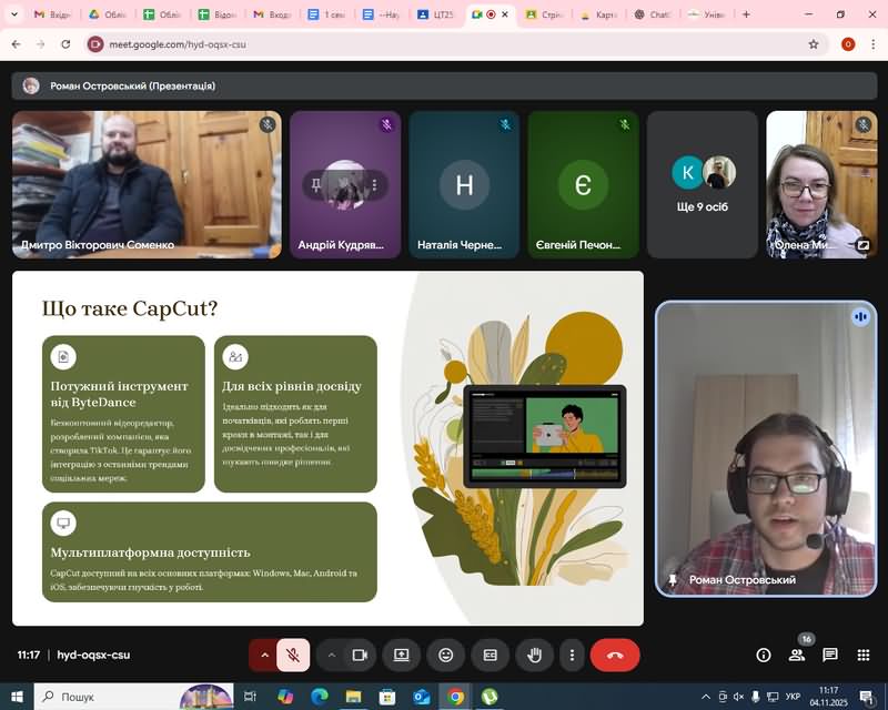 Під час лекції Роман Островський детально розповів про сучасні тенденції розвитку відеоконтенту в сфері освіти та медіа, продемонстрував можливості програми CapCut, яка є одним із найпопулярніших інструментів для створення коротких навчальних, рекламних та креативних відео. Студенти ознайомилися з базовими прийомами монтажу, роботою з переходами, ефектами, текстовими елементами, музичним супроводом та кольорокорекцією.