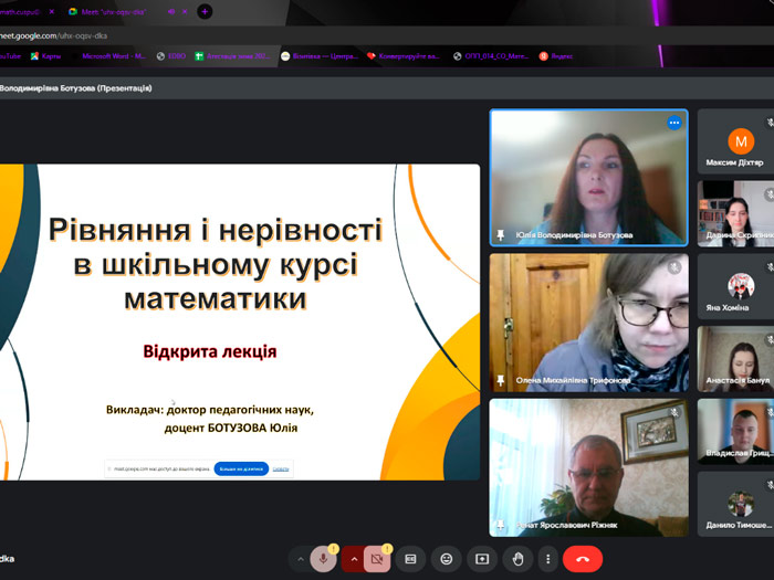 Доцент кафедри математики та цифрових технологій, доктор педагогічних наук Ботузова Юлія Володимирівна провела відкриту лекцію в межах навчальної дисципліни «Методика навчання математики» (групи МІ22Б, Ф22Б) на тему «Рівняння та нерівності у шкільному курсі математики».