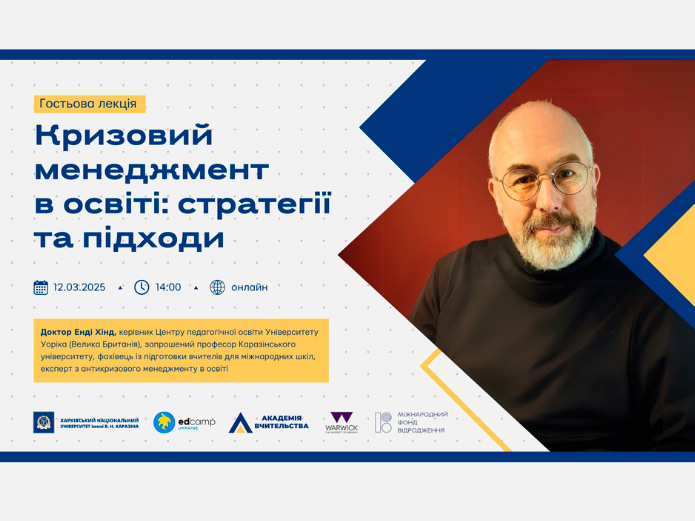 12 березня 2025 року відбулася гостьова лекція доктора Енді Хінда «Кризовий менеджмент в освіті: стратегії та підходи. Захід було організовано ННІ «Академія вчительства» Харківського національного університету імені В. Н. Каразіна за підтримки ГО «ЕдКемп Україна», Міжнародного фонду «Відродження», Університету Уоріка (Велика Британія).