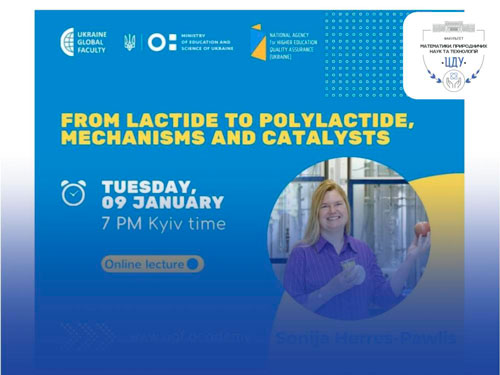 9 січня завідувачка кафедри біонеорганічної хімії Інституту неорганічної хімії Рейнсько-Вестфальського технічного університету Аахена (Німеччина) Соня Геррес-Павліс (Sonija Herres-Pawlis) провела лекцію «From lactide to Polylactide, mechanisms and catalysts».