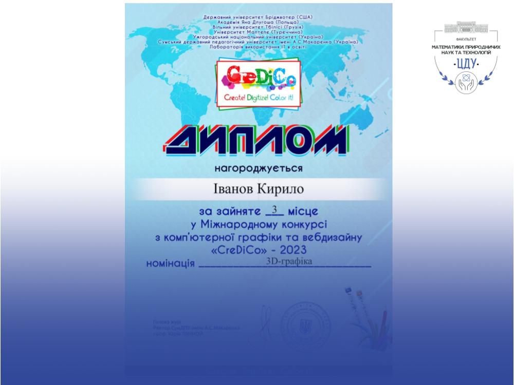 Кирило Іванов – студент спеціальності Професійна освіта (Цифрові технології) Центральноукраїнського державного університету імені Володимира Винниченка отримав диплом за зайняте ІІІ місце у Міжнародному конкурсі з комп’ютерної графіки та вебдизайну «CreDiCo»-2023 номінація «3D-графіка». Наставниками Кирила стали викладачі кафедри математики та цифрових технологій: д.пед.н., проф. М.І.Садовий, к.пед.н. Д.В.Соменко, д.пед.н., проф. О.М.Трифонова (науковий керівник).