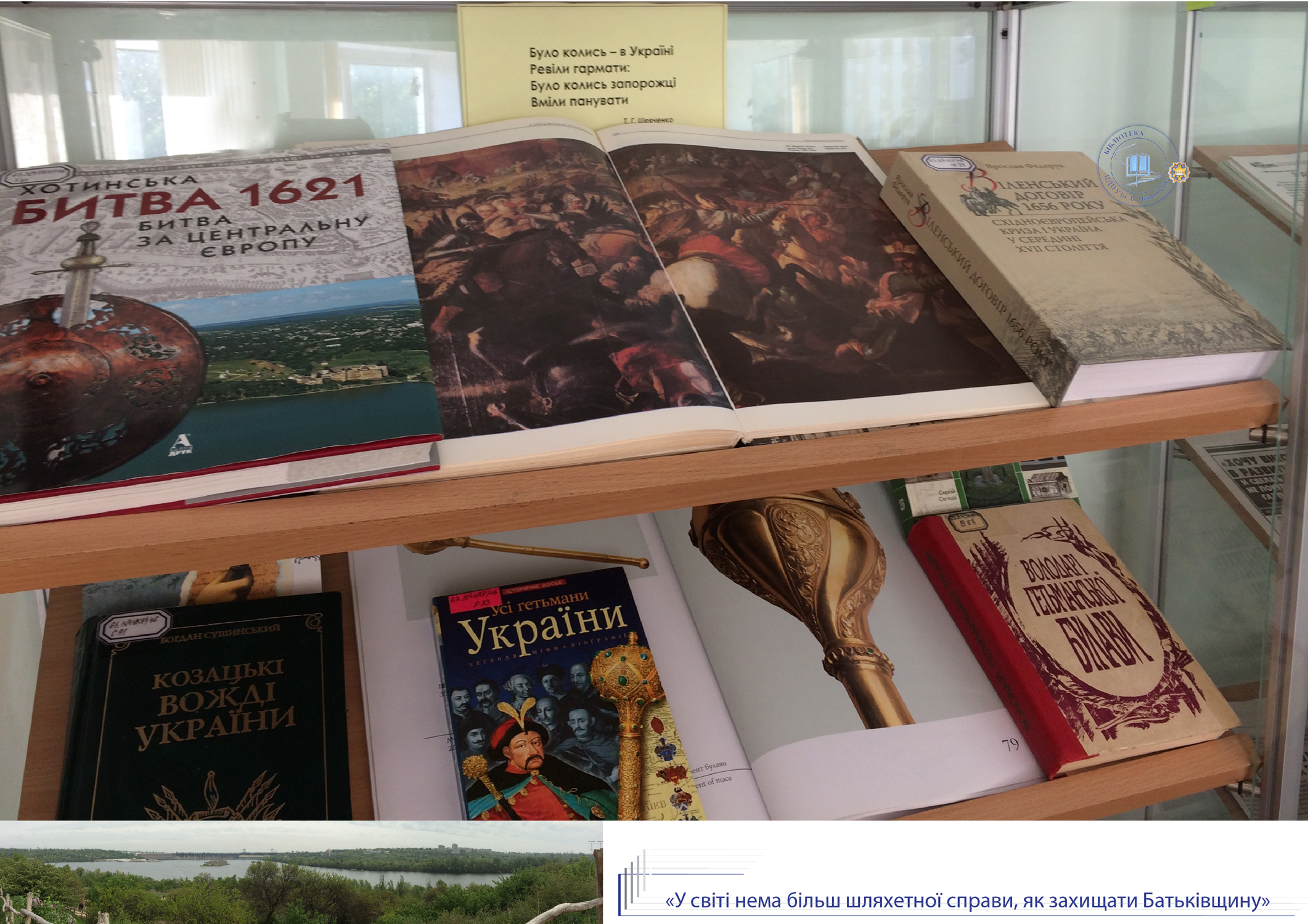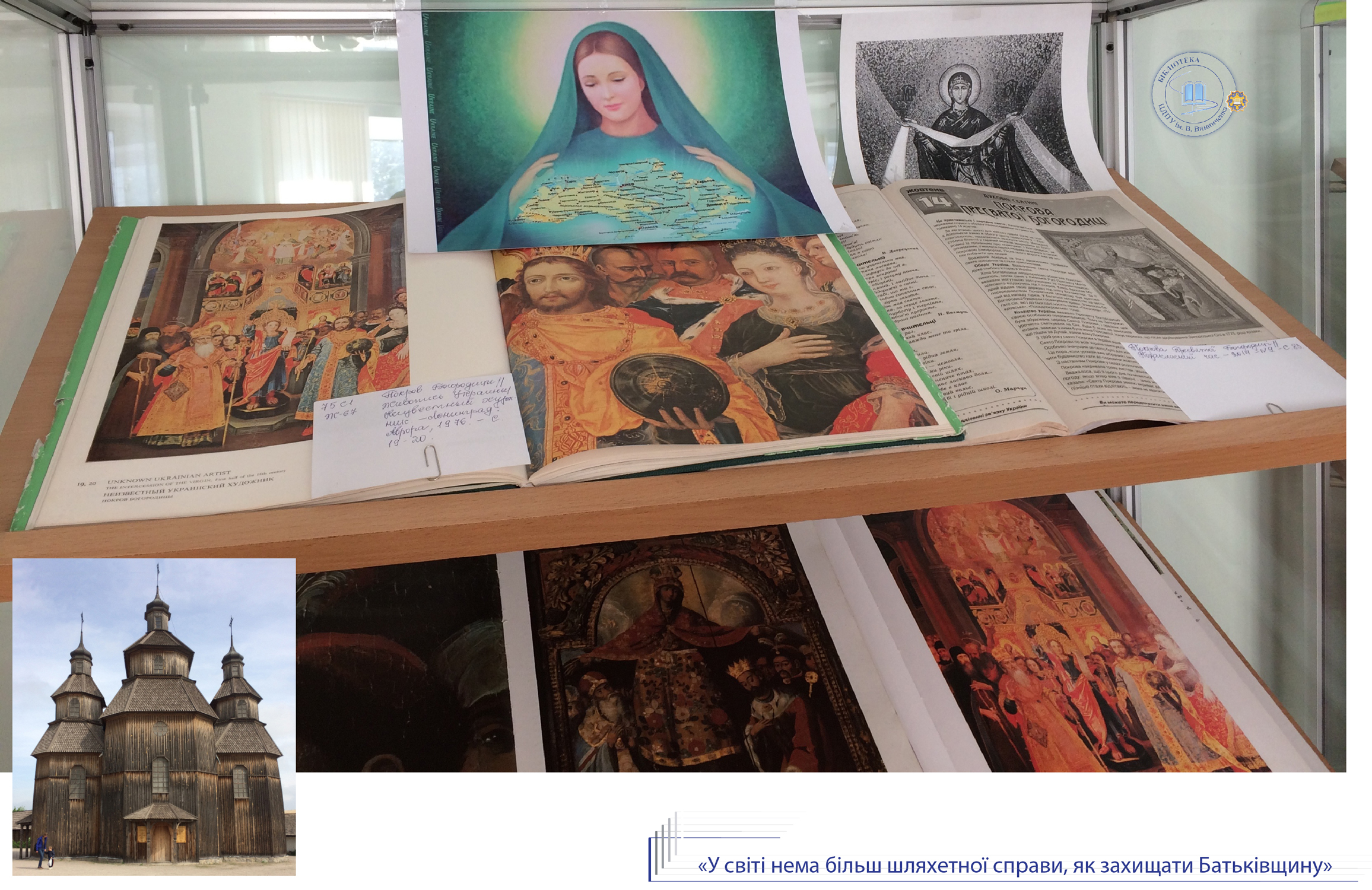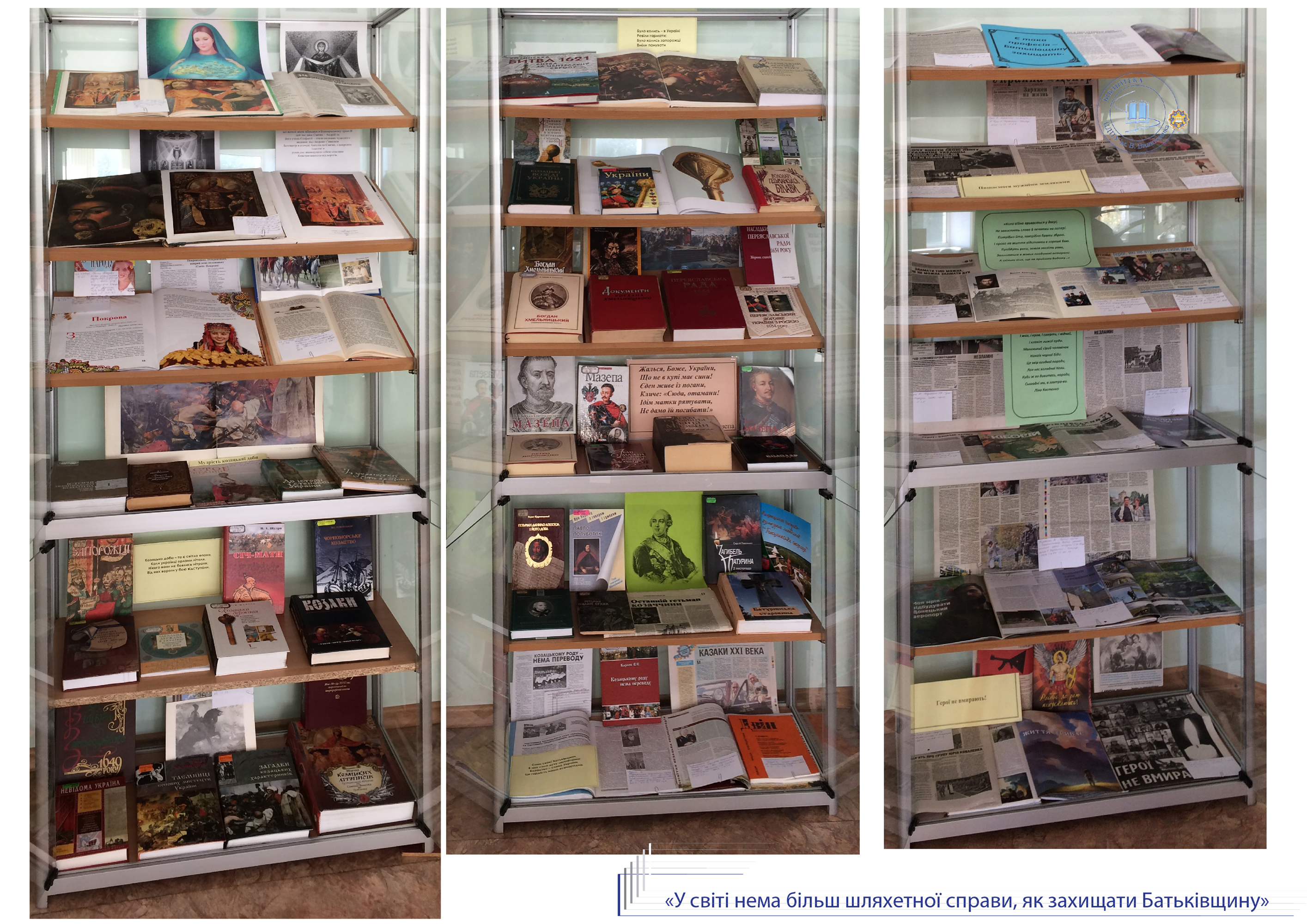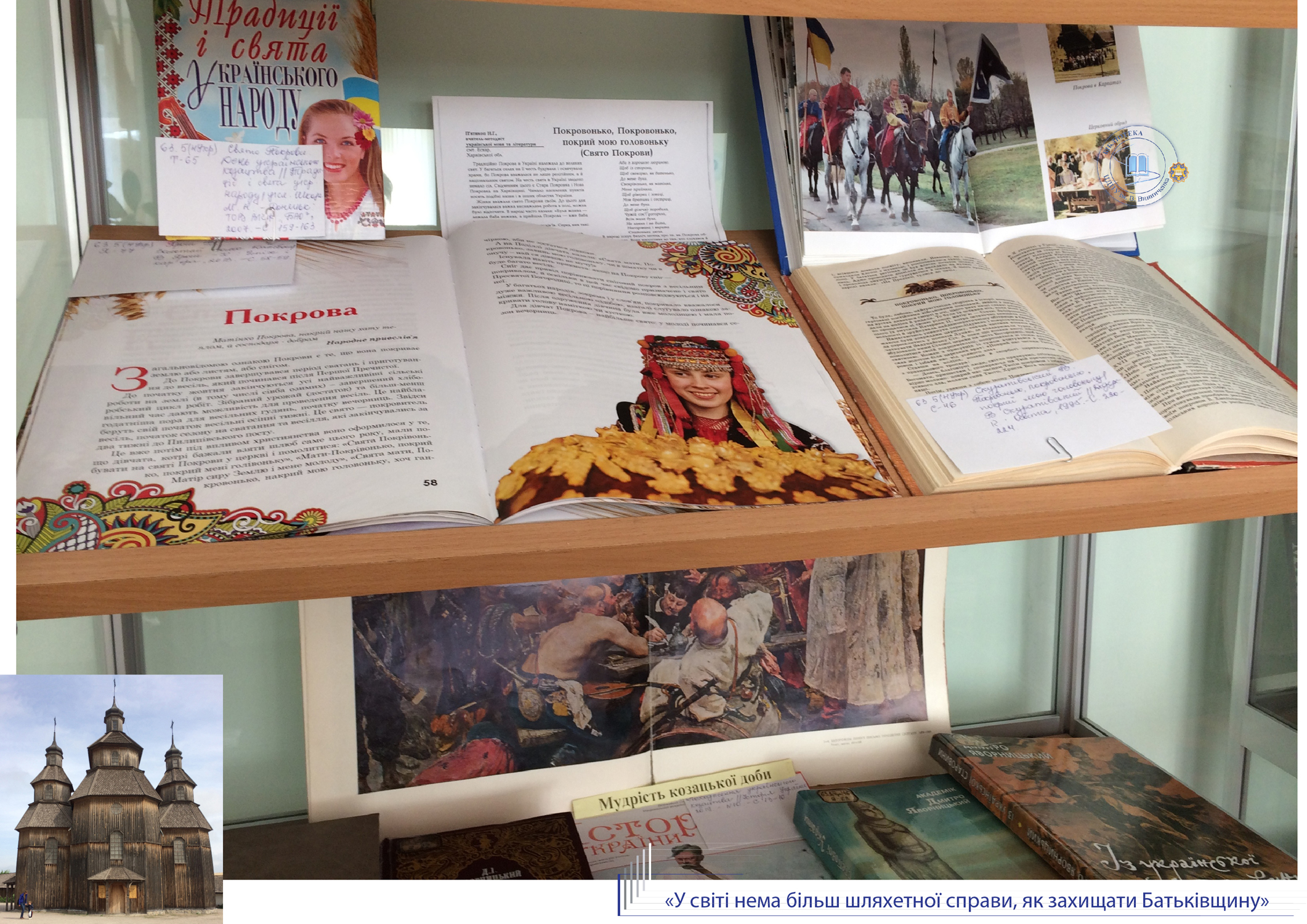 До Дня Захисника України, Дня козацтва та покровительки воїнів Покрови Пресвятої Богородиці універсальний читальний зал бібліотеки присвячує розгорнуту ілюстровану виставку «У світі нема більш шляхетної справи, як захищати Батьківщину». Книги з історії України, етнографії, мистецтвознавства висвітлюють сторінки славної доби козацтва, традиції вшанування нашими предками свята Покрови.