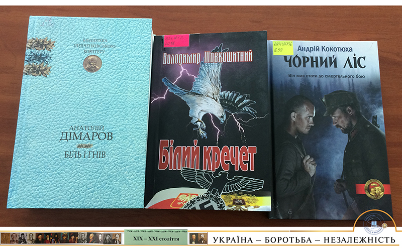 - роман «Чорний ліс» А. Кокотюхи присвячений боротьбі українських повстанців і радянських партизанів під час Другої світової війни;
