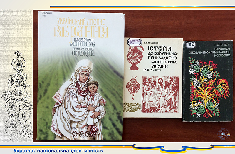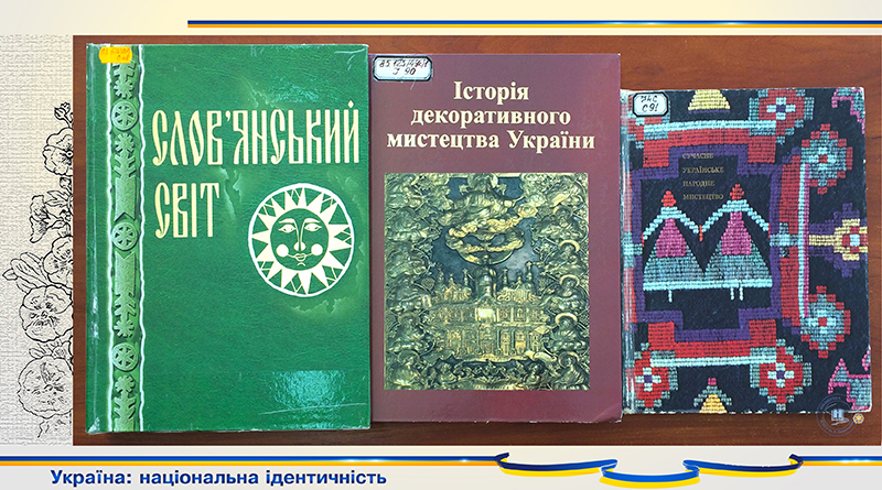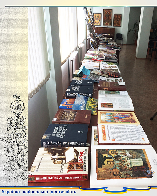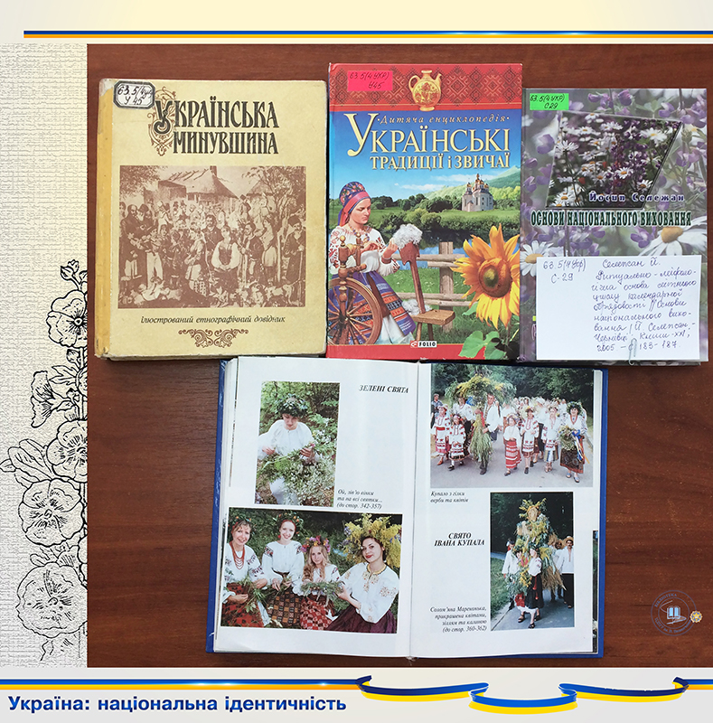 Перший розділ тематичної експозиції «Україна: національна ідентичність» знайомить читачів із національною культурою, яка є унікальною і самобутньою та ґрунтується на витоках народності. Адже творцем української національної культури є український народ, який створив її упродовж багатьох століть, що знайшло відображення у моральних цінностях, святинях, національній символіці, у традиціях, звичаях та обрядах.