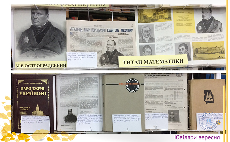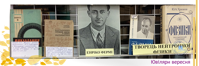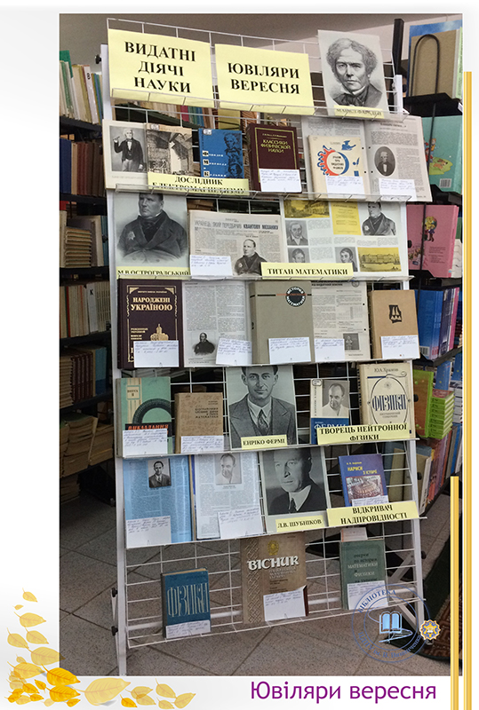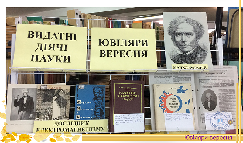 Вересень щедрий на ювілеї видатних учених, які зробили вагомий внесок у розвиток фізико-математичних наук. Це – М. Фарадей, М. В. Остроградський, Е. Фермі, Л. В. Шубников. До уваги читачів бібліотекарями абонементу № 2 запропонована виставка “Видатні діячі науки”. Вони — дослідники різних країн, великі подвижники від науки, праці яких ще довго залишатимуться не почесними архівними експонатами, а дієвим інструментом пізнання закономірностей природи.