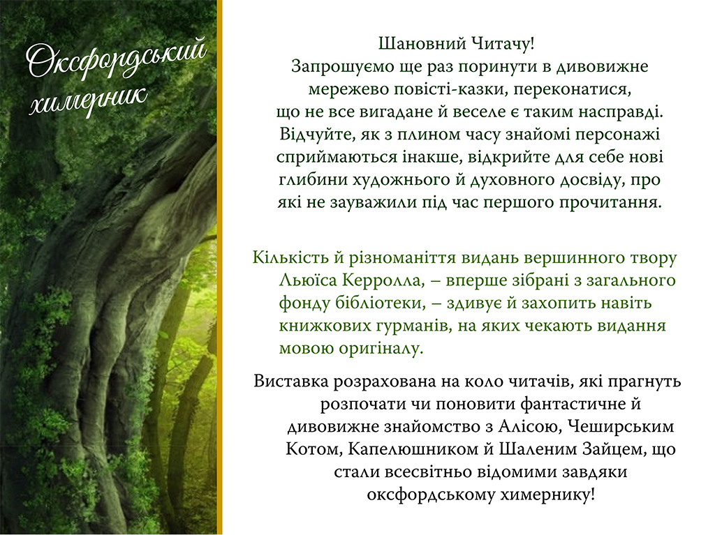 Виставка розрахована на коло читачів, які прагнуть розпочати чи поновити фантастичне й дивовижне знайомство з Алісою, Чеширським Котом, Капелюшником й Шаленим Зайцем, що стали всесвітньо відомими завдяки оксфордському химернику!