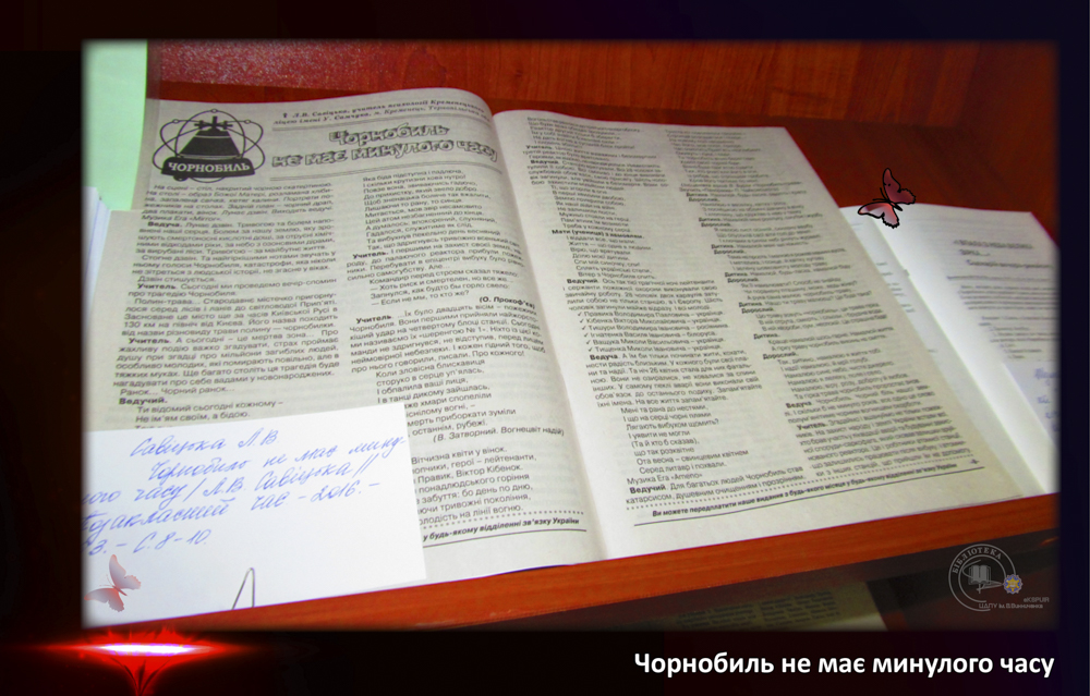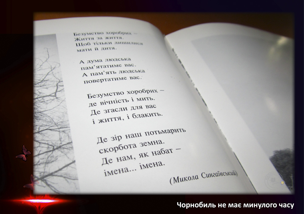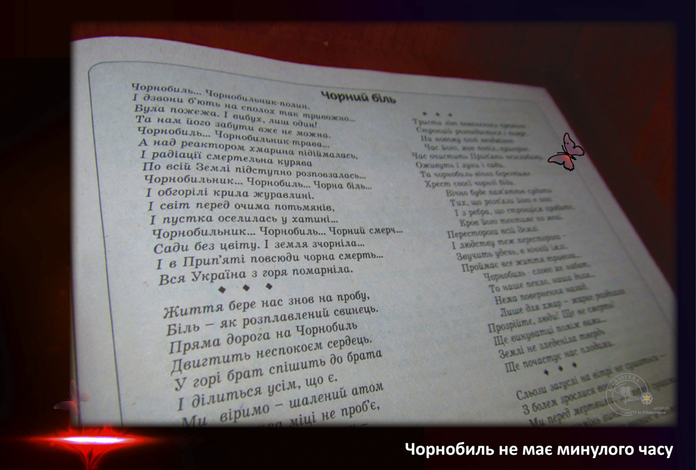 Скільки б часу не пройшло від того лиховісного дня 26 квітня 1986 року, Чорнобиль продовжує стукати в наші серця, пронизувати душі гіркотою полинною. І ми не в праві забувати ту страшну подію, тих відважних людей, які ціною свого здоров’я, а то і життя, змогли зупинити загрозливий атомний вогонь.