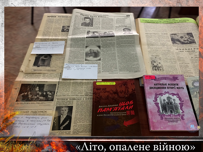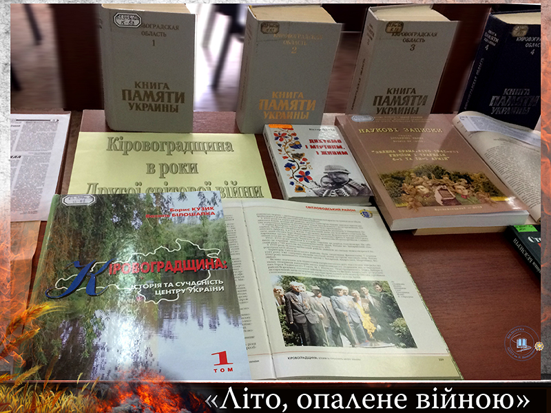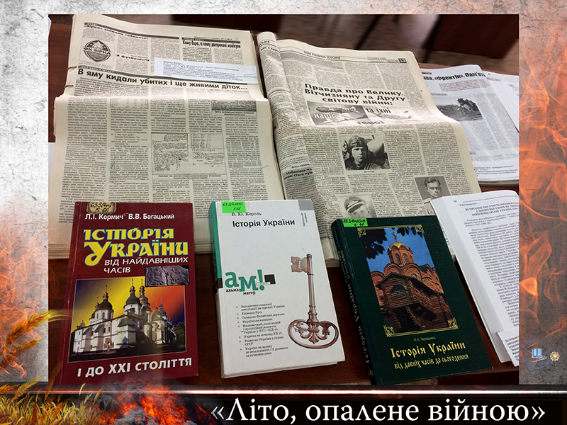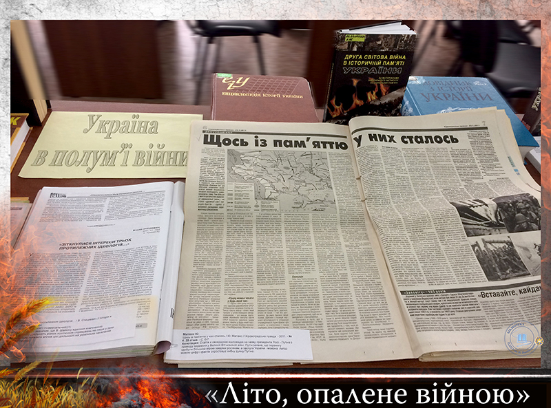 22 червня 1941 року гітлерівські війська підступно і без попередження розпочали війну на українській землі. Цей день став для України Днем глибокої скорботи. Бібліотекарі універсального читального залу підготували книжкову ілюстровану виставку «Літо, опалене війною», яка розкриває увесь трагізм, що пережили українці.
