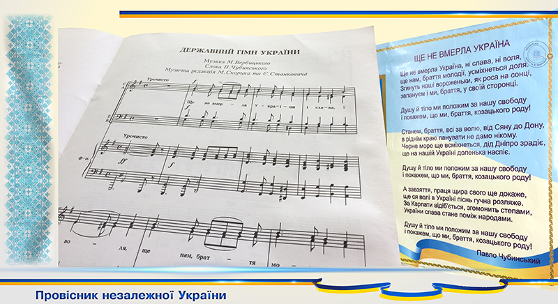 Виставка одного твору «Провісник незалежної України» присвячена головній пісні нашої країни — Державному Гімну.