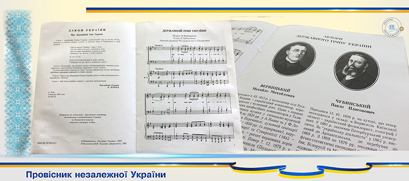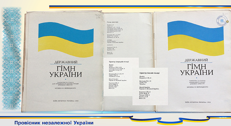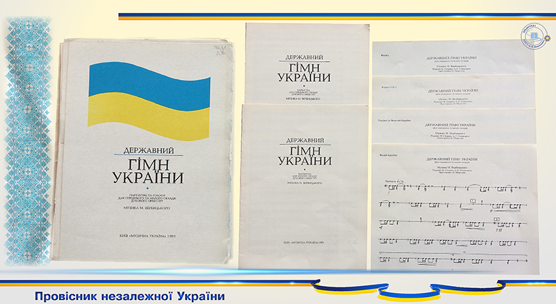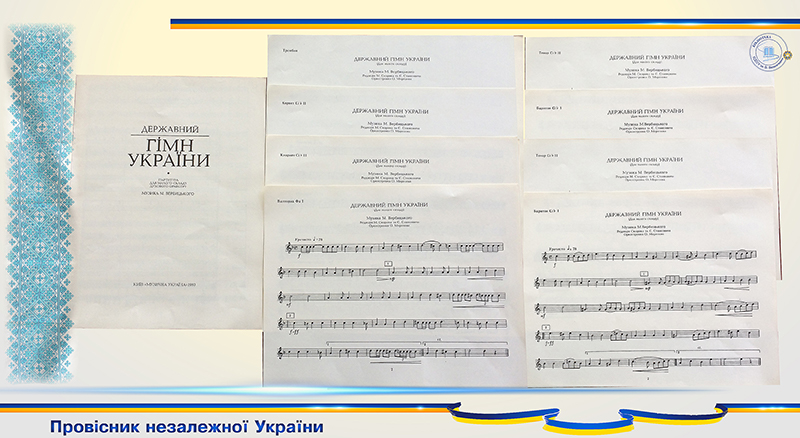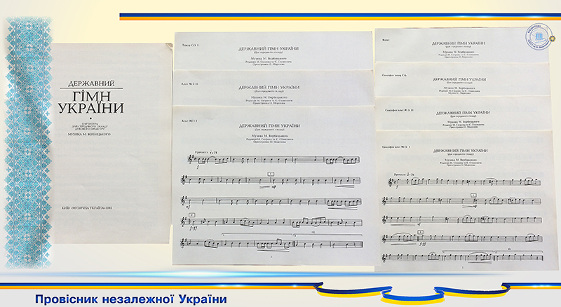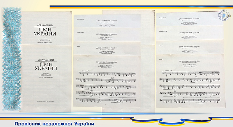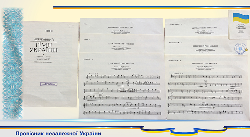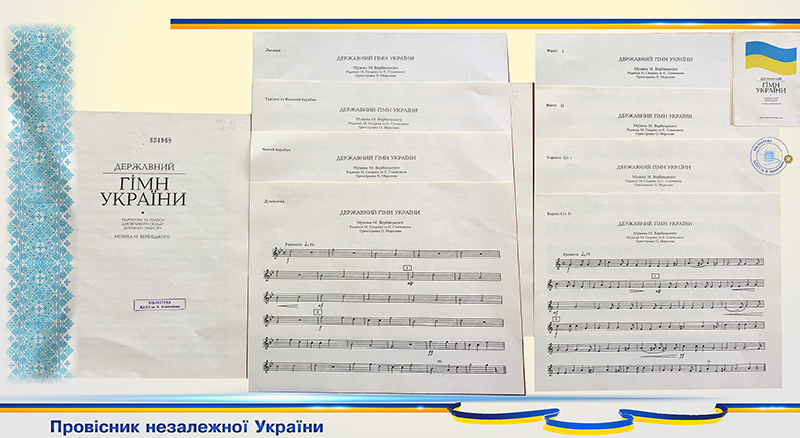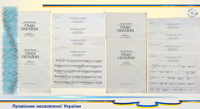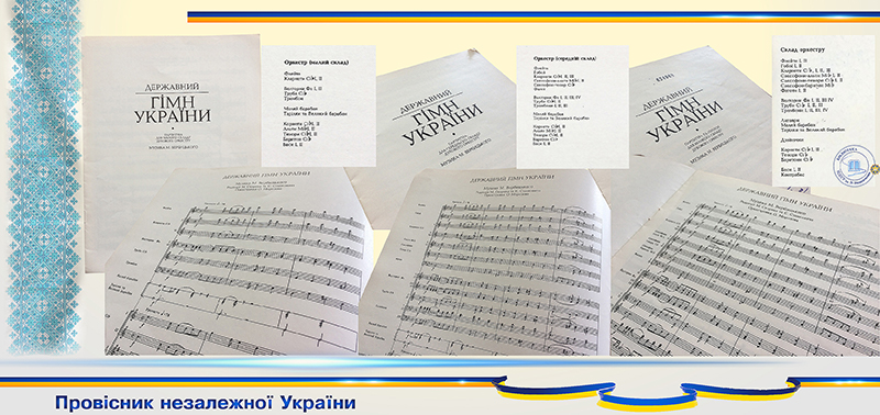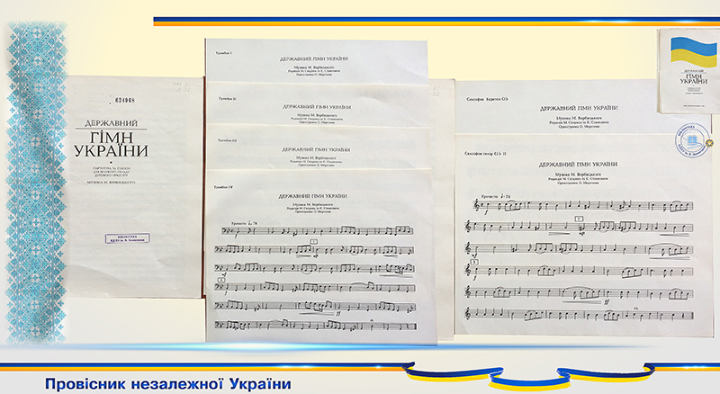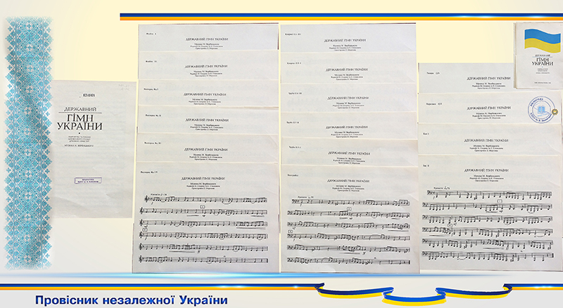 На виставці представлені партитури та голоси Державного Гімну України для середнього та малого складів духового оркестру та партитура та голоси для великого складу духового оркестру на музику Михайла Вербицького, видавництва «Музична Україна» 1993 року.