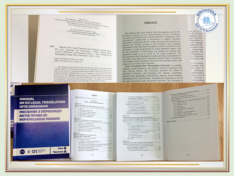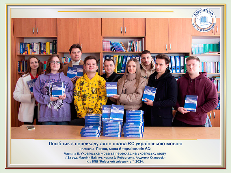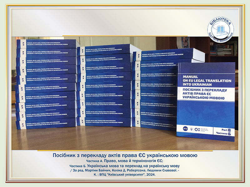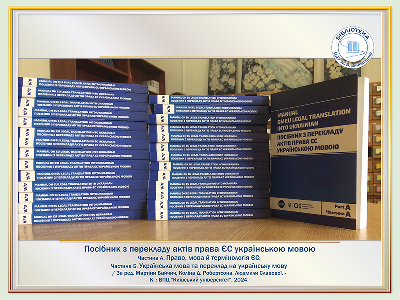 Шановні користувачі університетської бібліотеки! Раді повідомити, що до нашої бібліотеки надійшло видання: "Посібник з перекладу актів права ЄС українською мовою", де представлено теоретичні матеріали, таблиці, додатки та текстові моделі, що допоможуть у перекладі правових документів.