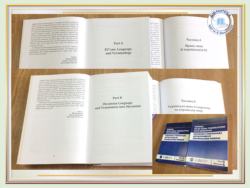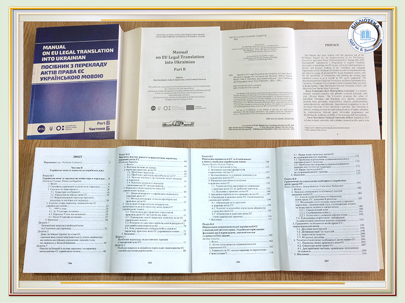 Частина Б: "Українська мова та переклад на українську мову" (289 с.), яка спрямована на вирішення перекладацьких та термінологічних проблем, зокрема, у контексті перекладу актів ЄС українською мовою.