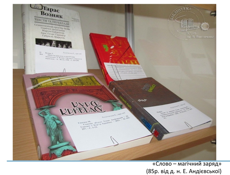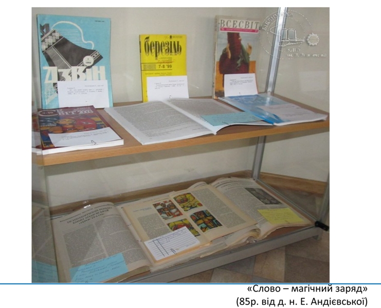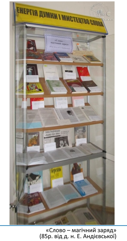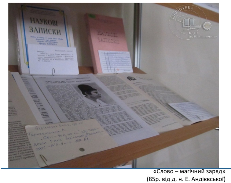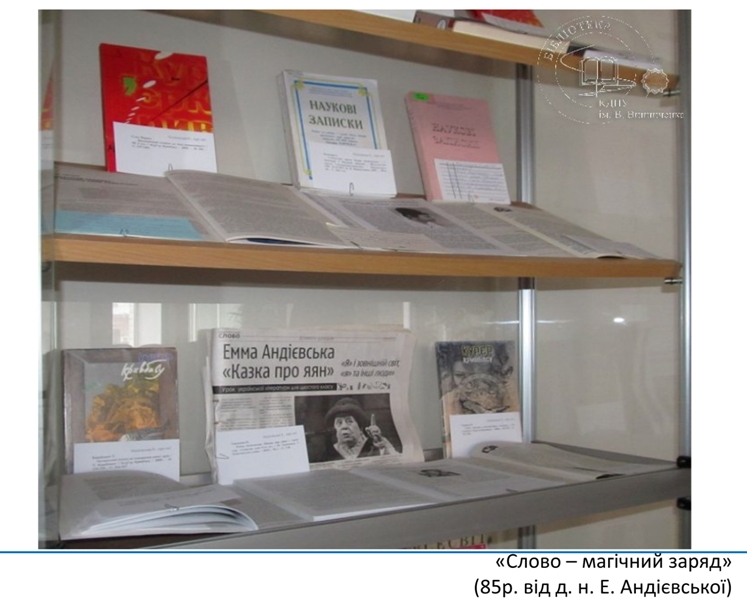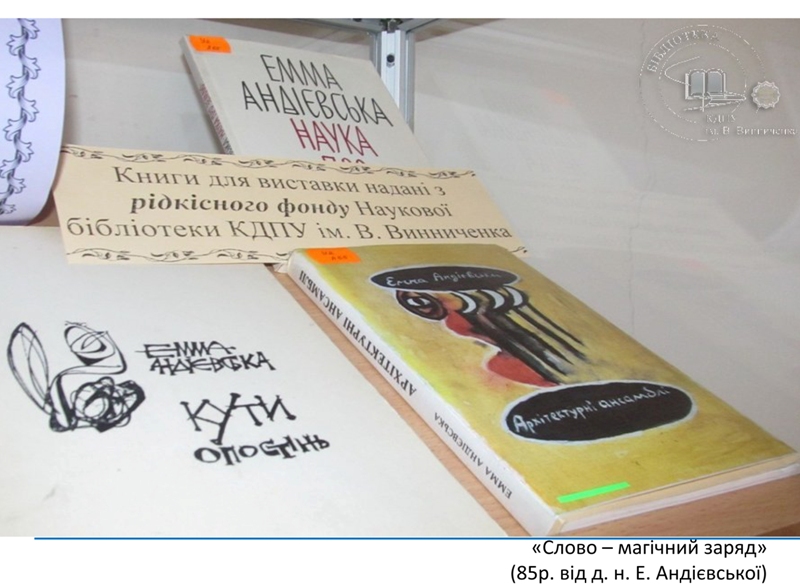 В читальному залі філологічних дисциплін бібліотеки університету, з 18 по 28 березня експонується виставка «Слово – магічний заряд», присвячена 85-й річниці від дня народження Емми Андієвської. Допитливий читач має змогу ознайомитися детальніше з відомою усьому світові поетесою, яка все життя прожила за межами України, але серцем і душею завжди була з нею.
