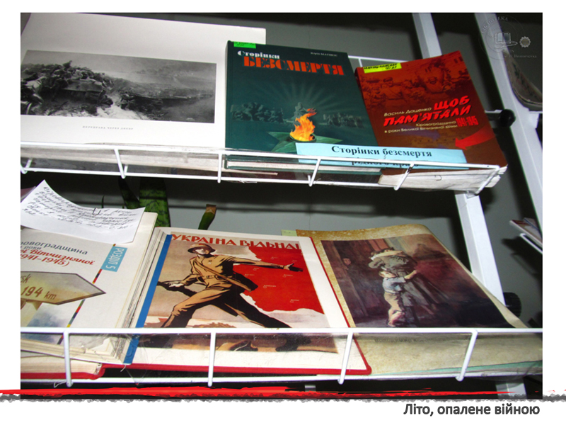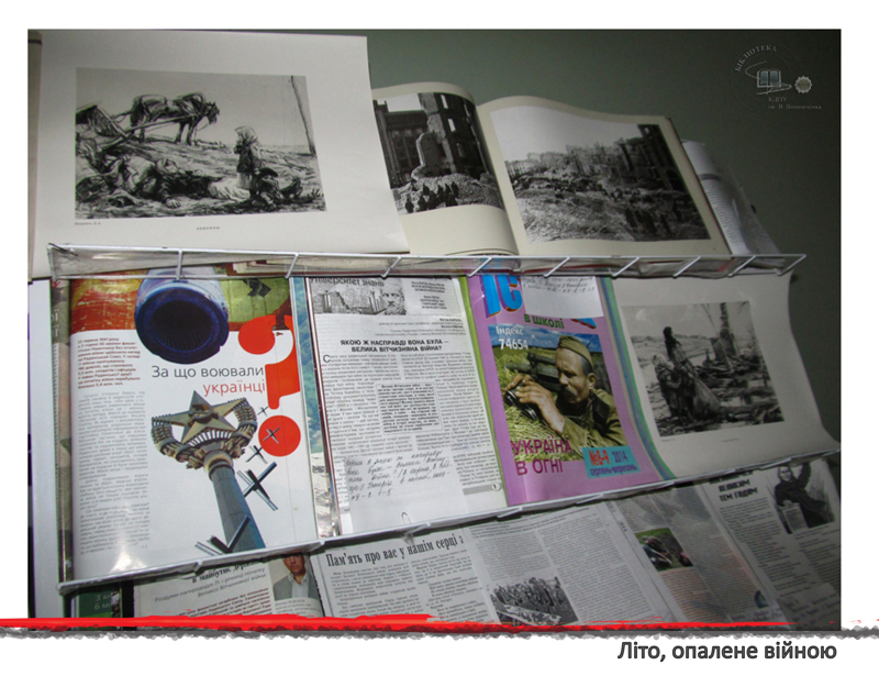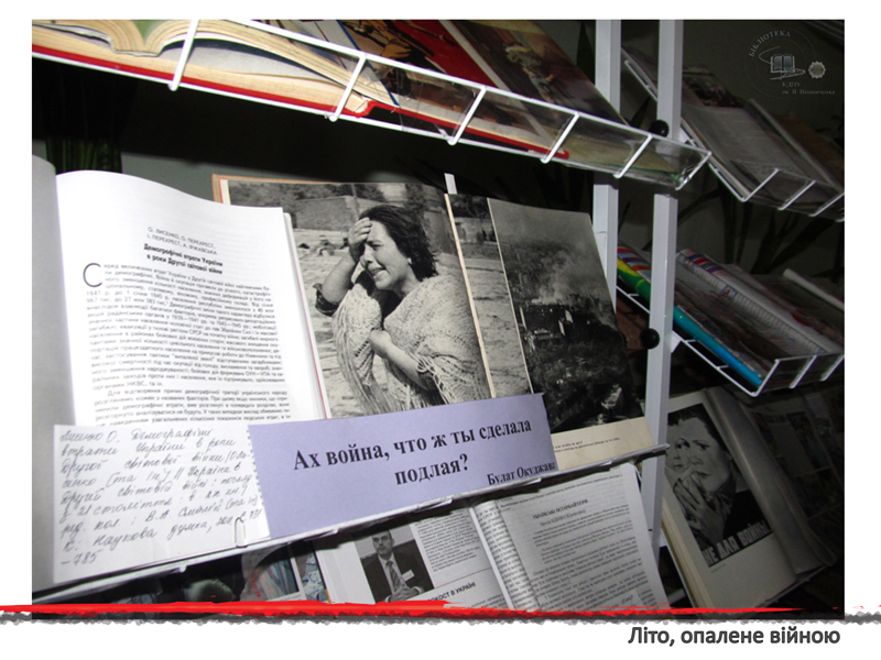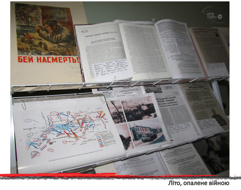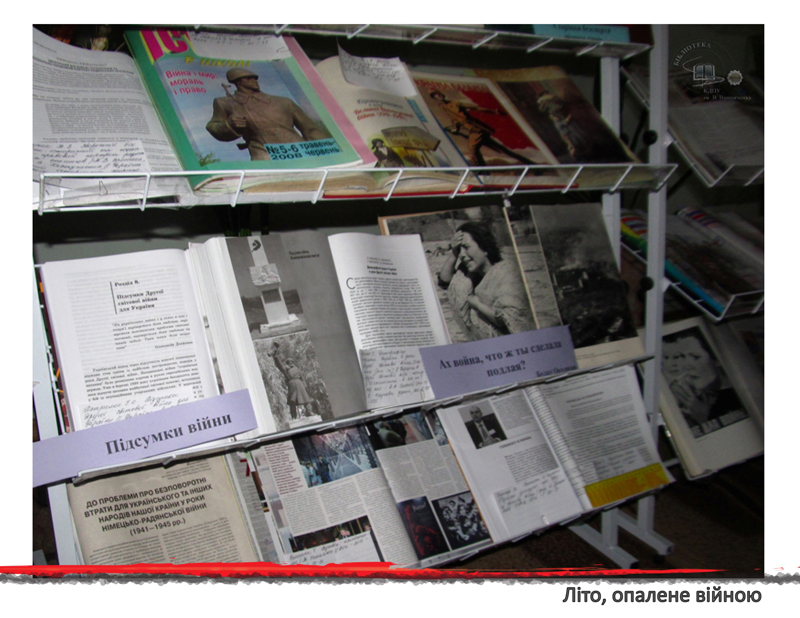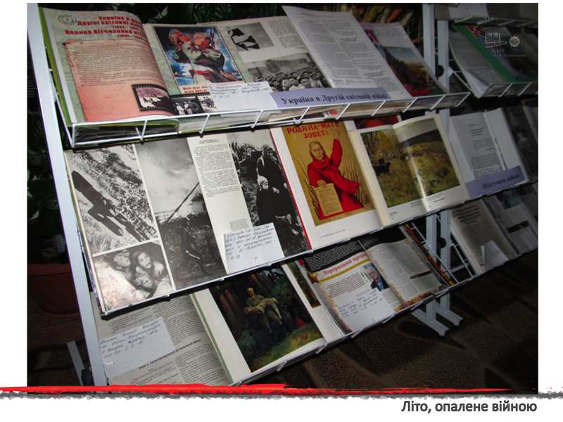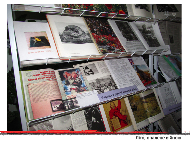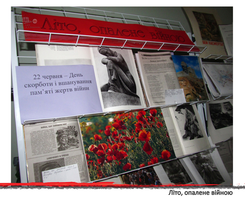 22 червня 1941 року гітлерівські війська підступно і без попередження розпочали війну. Цей день став для України Днем глибокої скорботи. Бібліотекарі універсального читального залу підготували виставку «Літо, опалене війною», яка розкриває увесь трагізм, що пережили українці.