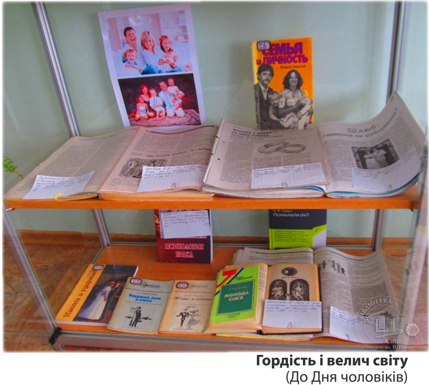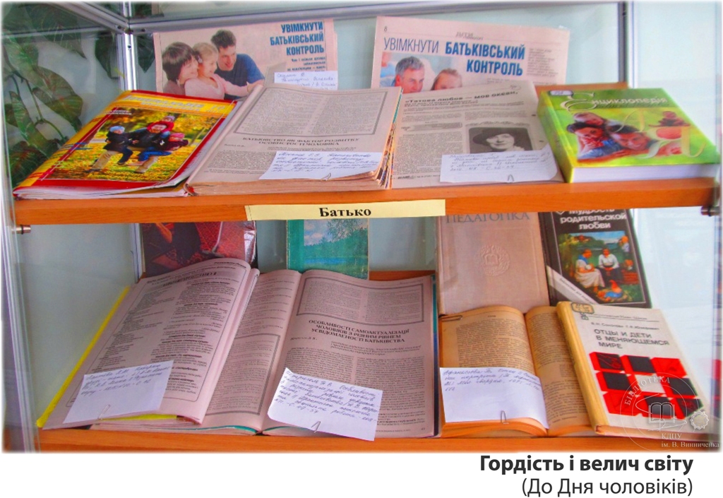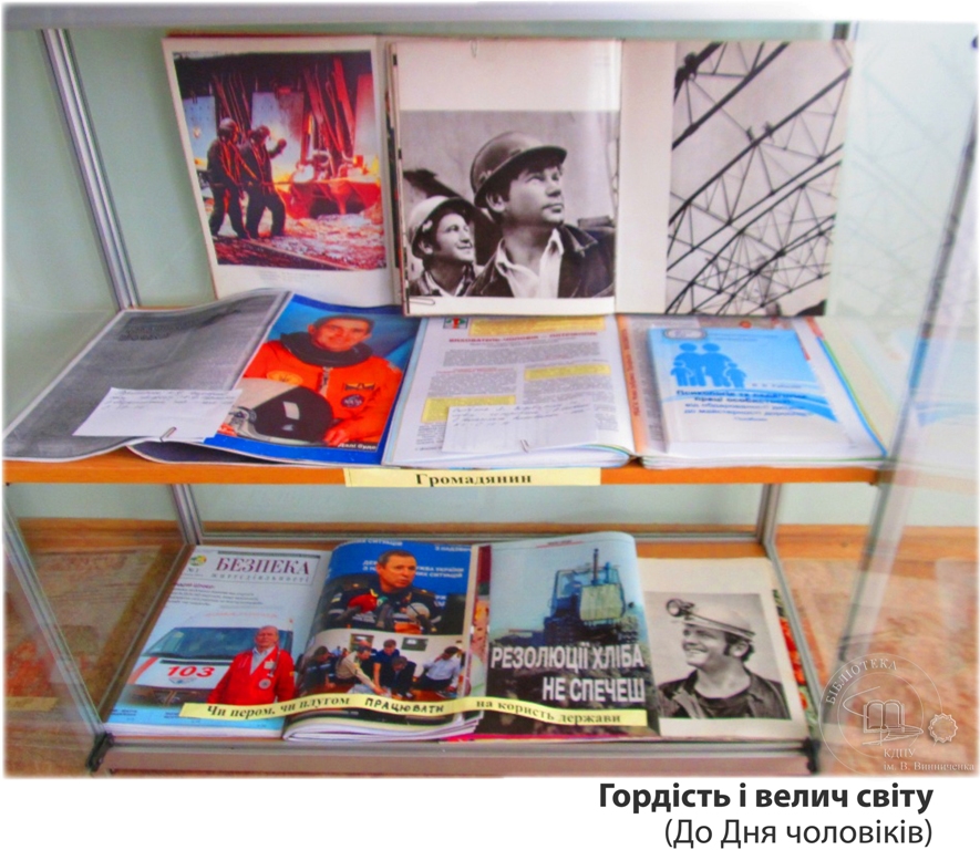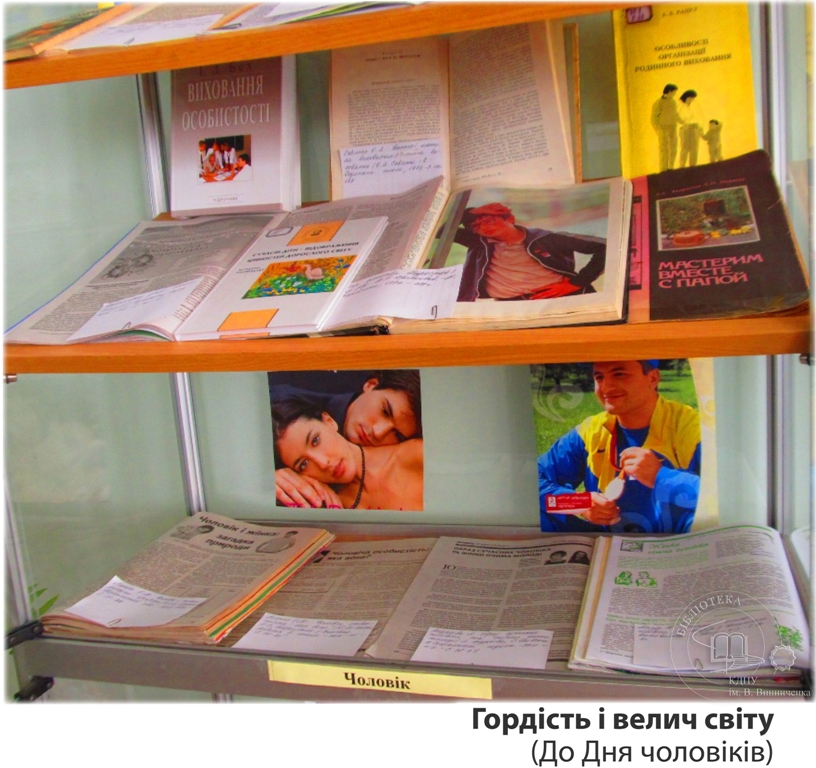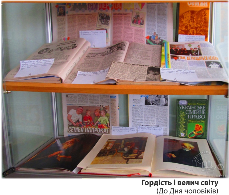 До Дня чоловіків бібліотекарі універсального читального залу підготували виставку під назвою «Гордість і велич світу», яка познайомить читачів з етапами життя нашої сильної половини: від народження і до зрілості. Спочатку приділена увага хлопчикам: їх фізіології, емоційному, фізичному і духовному благополуччю, особливостям виховання. У рубриках: «Чоловік», «Батько», «Громадянин» розкривають місце чоловіка в суспільстві, важливість їх ролі в сім’ї, у вихованні дітей.