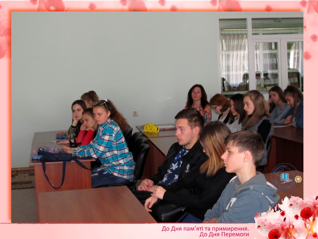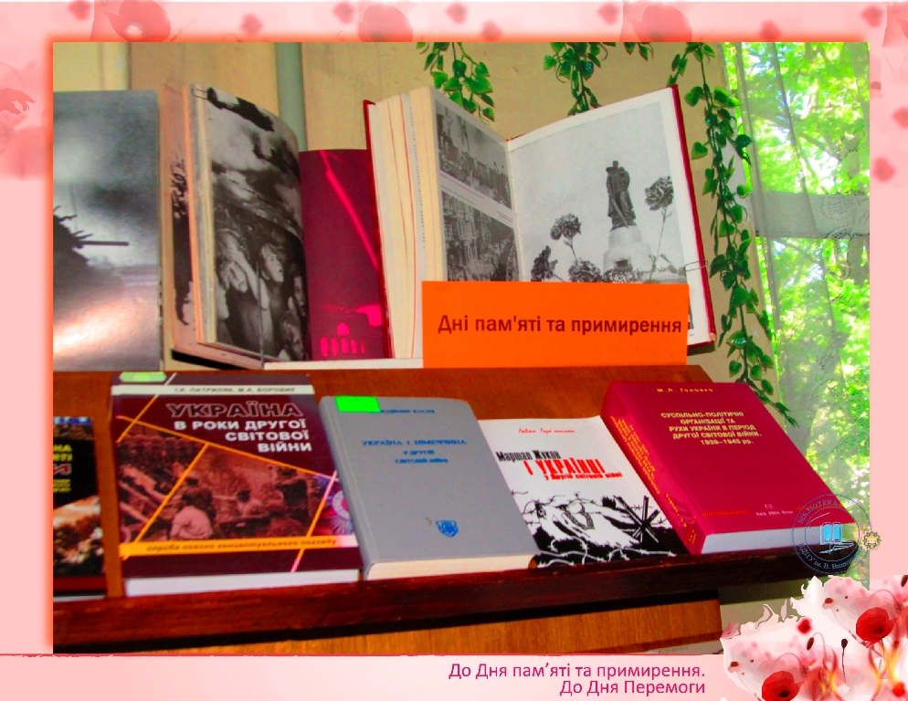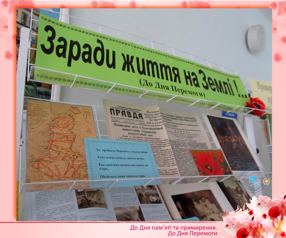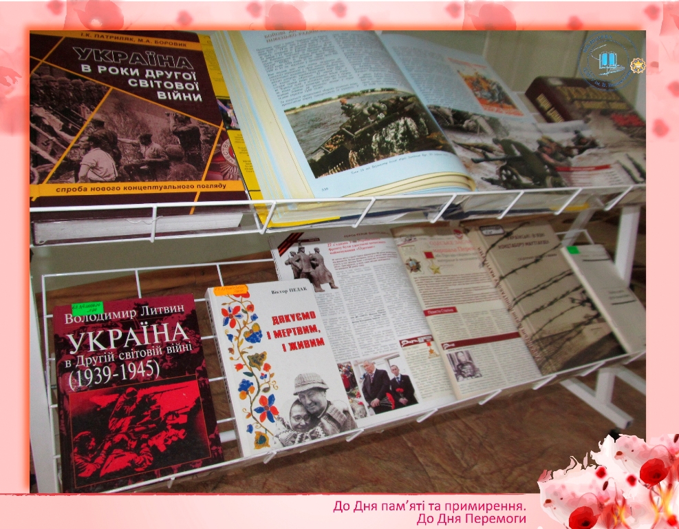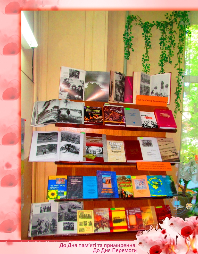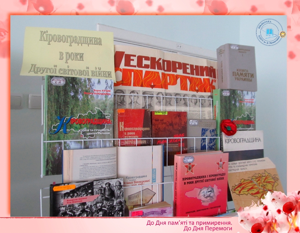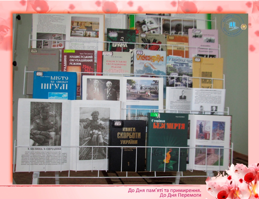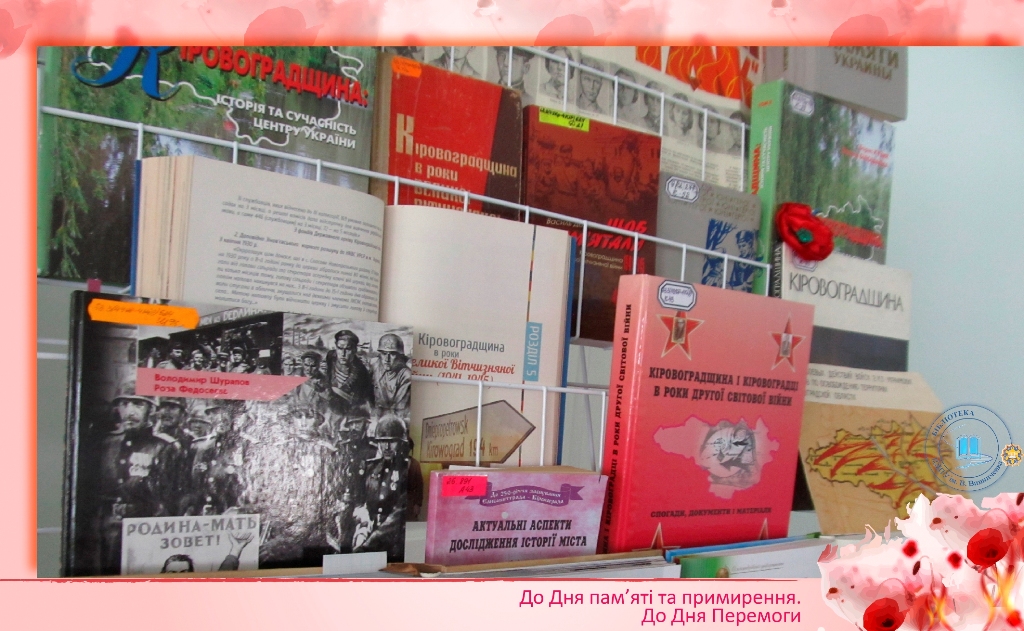 З нагоди Дня пам’яті і примирення та Дня Перемоги над нацизмом у Другій світовій війні бібліотека Кіровоградського державного педагогічного університету імені В. Винниченка присвятила низку заходів. Бібліотекарі читальних залів та абонементів для учнів ліцею провели розгорнутий огляд книжкових виставок: «День пам’яті і примирення», «Заради життя на Землі», «Кіровоградщина у роки Другої світової війни», «Слово і подвиг».