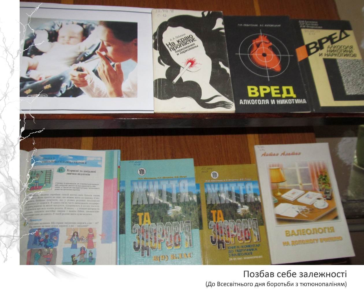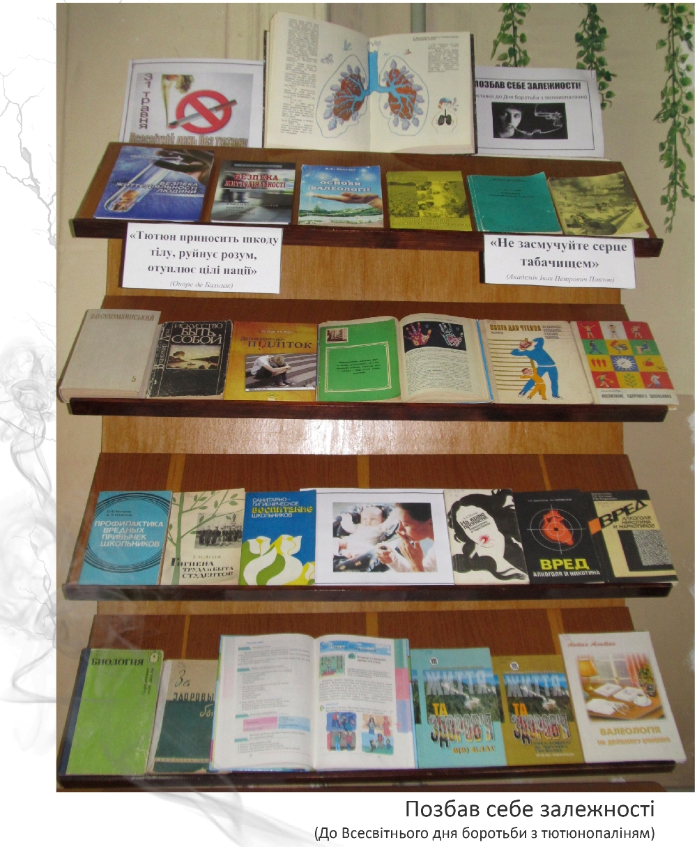 Читачам виставки пропонуються книги, які аналізують причини психологічної готовності до вживання тютюну: «Основи здоров’я» С.В. Василенко, Н.І.Гущиної, О.І. Манюк та «Искусство быть собой» відомого практикуючого психолога Володимира Леві. Отримати повну уяву про руйнівні наслідки тютюнопаління для підліткового організму, функціональні порушення в роботі більшості життєво важливих органів (в тому числі репродуктивних) допоможуть книги В.М. Бенюмової, О.О. Костенко, К.М. Флоренсової «Вред алкоголя, никотина и наркотиков», А.Алатона «Валеологія. На допомогу вчителю», збірник лекцій «За здоровый быт» (наук. ред. М.І. Ліфанов) та ін.
