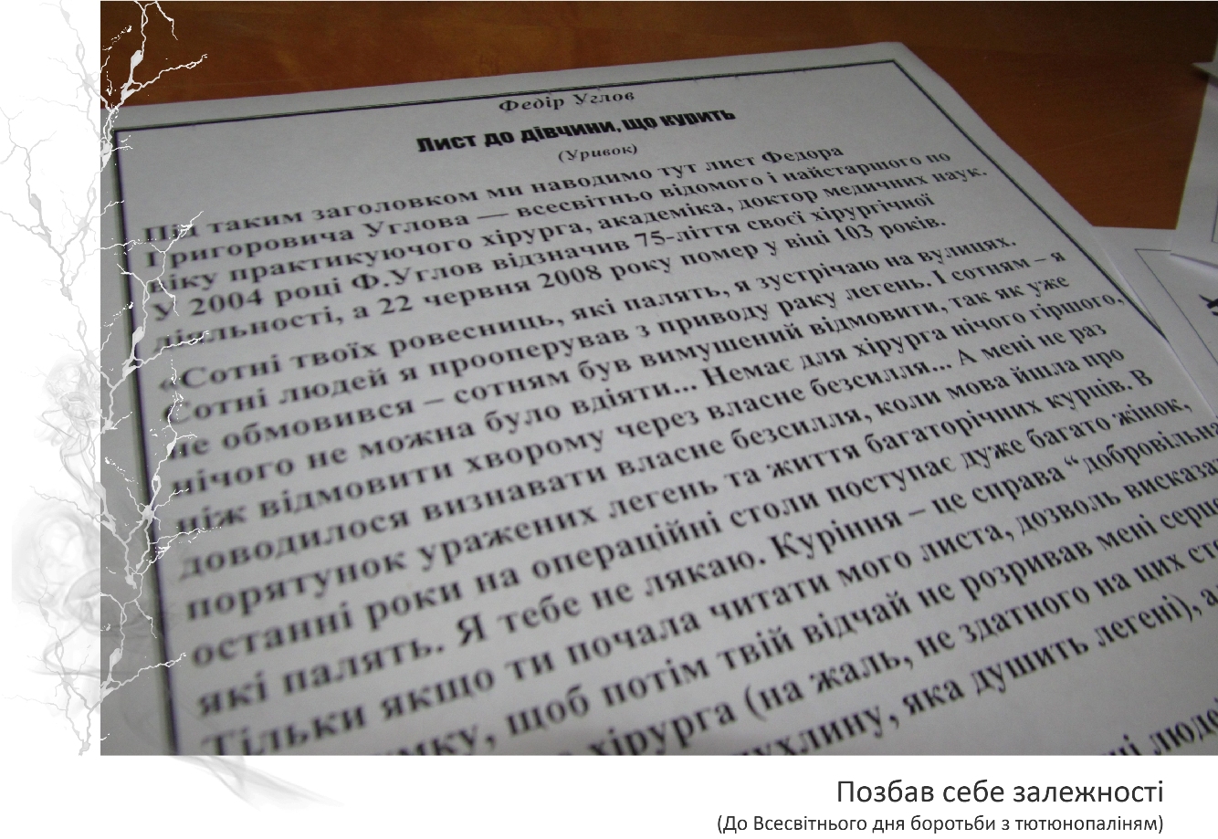 Виставка доповнена цікавими матеріалами, ілюстраціями та афоризмами відомих людей про шкідливі наслідки тютюнопаління.