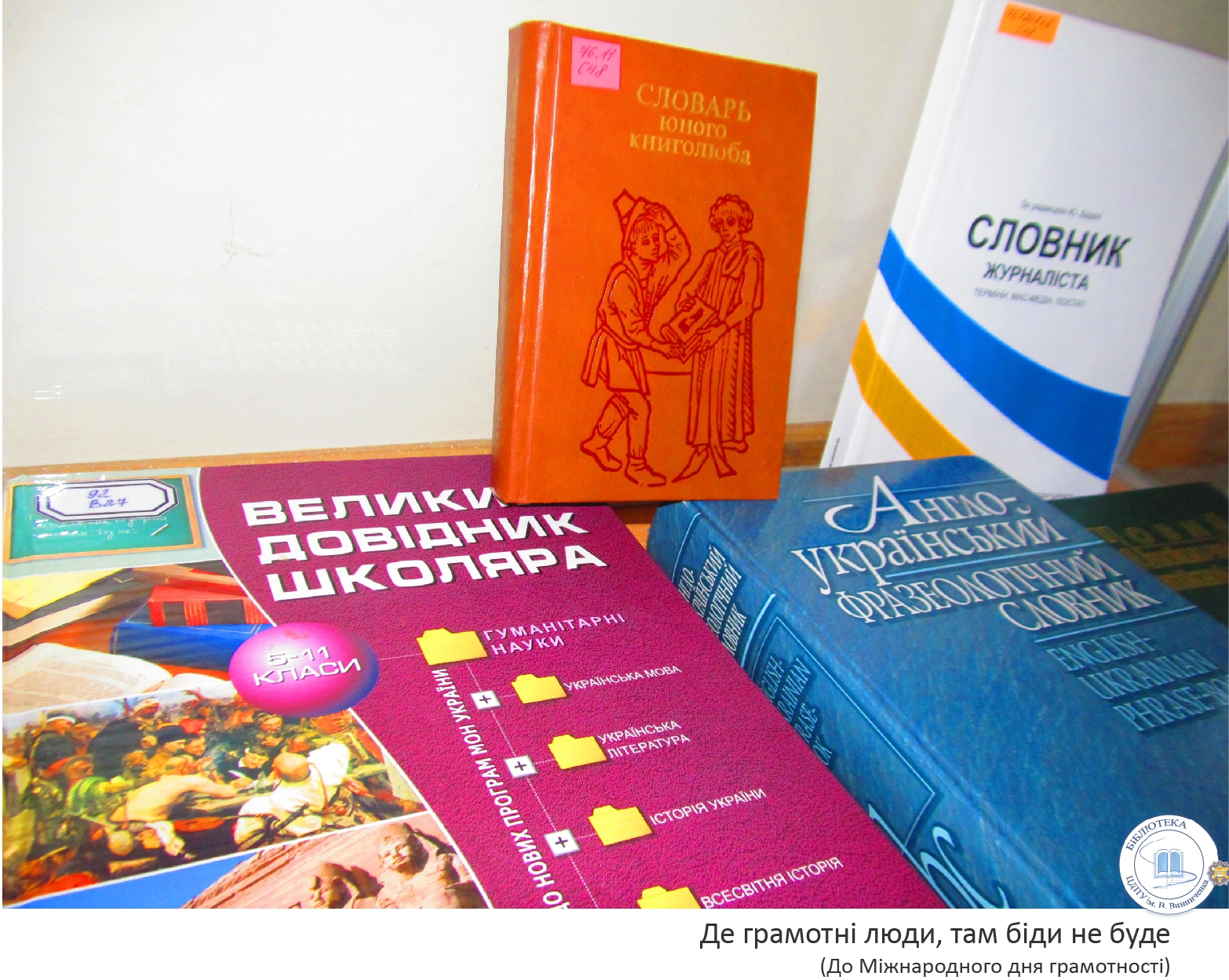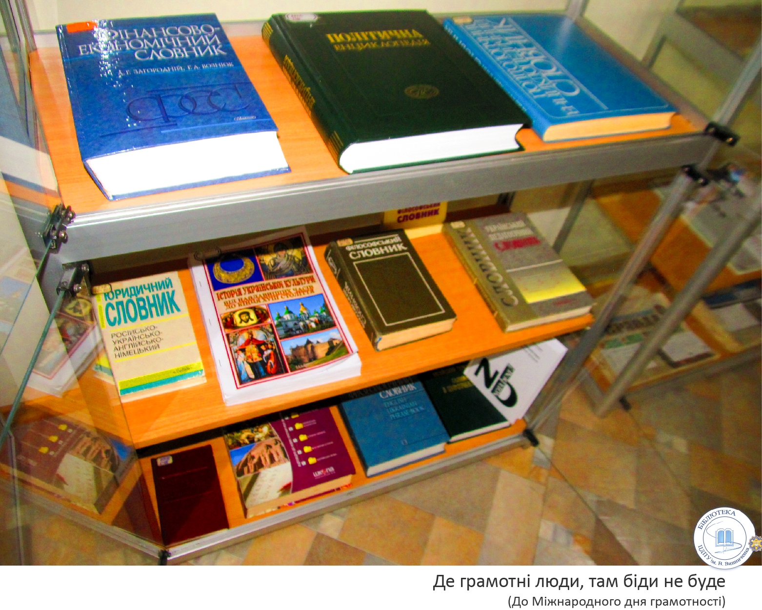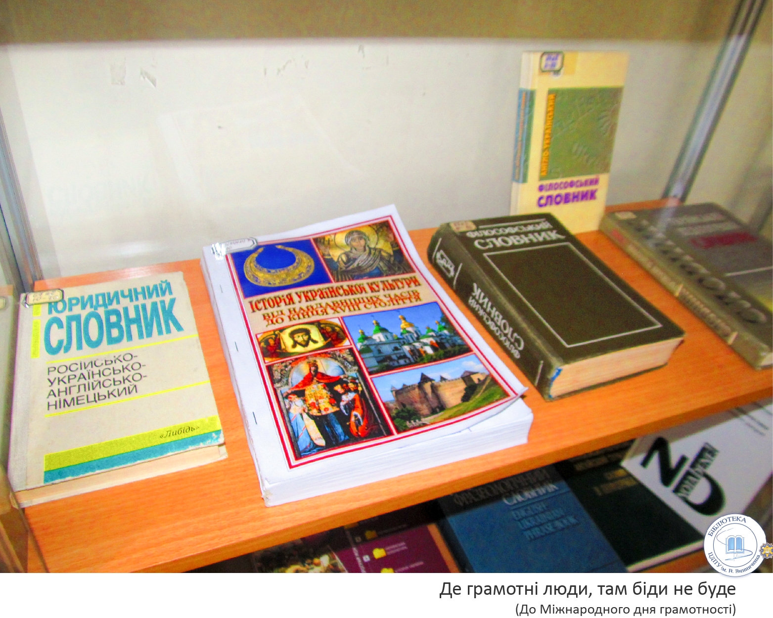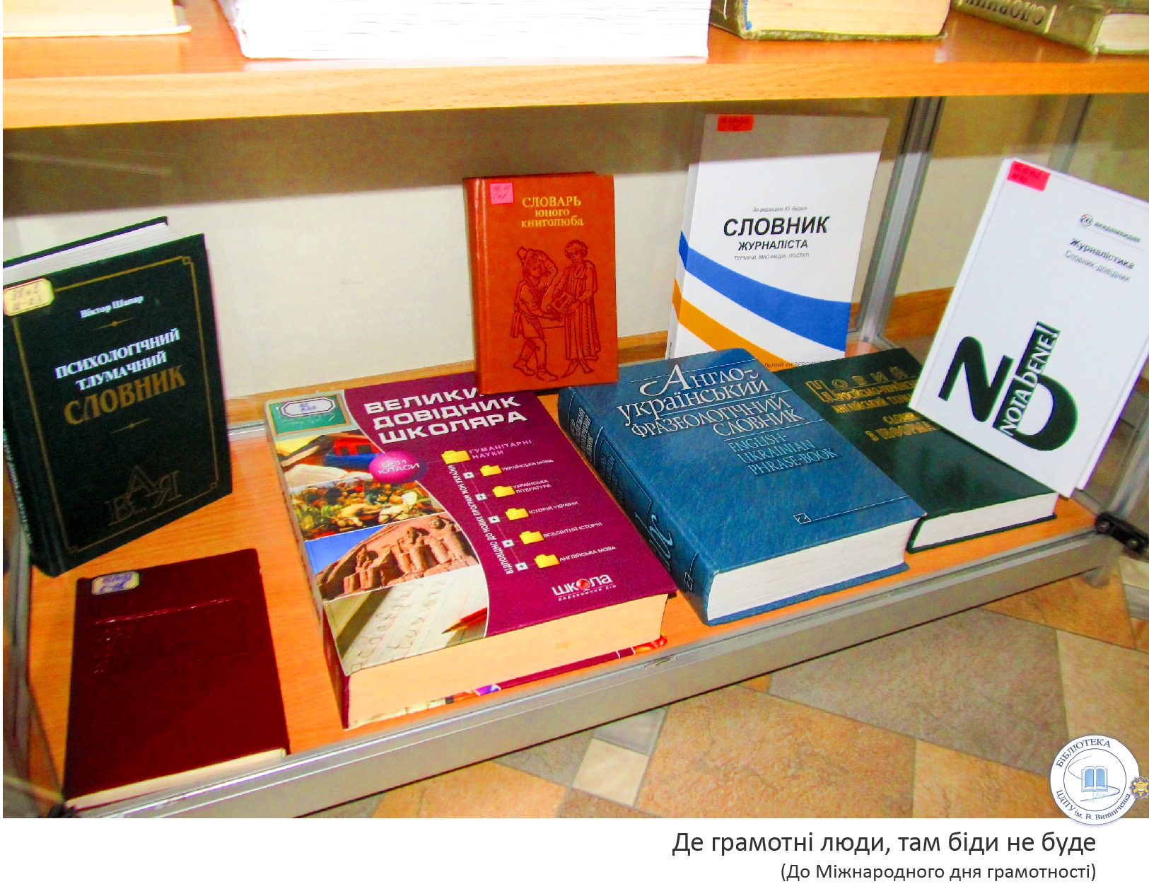 До уваги читачів читального залу філологічних дисциплін пропонується книжкова виставка, присвячена Міжнародному дню грамотності. Це свято офіційно відзначається 8 вересня Організацією Об’єднаних Націй. Запропонована виставка дає змогу відвідувачам знайти необхідні їм довідкові матеріали, до їхньої уваги підібрані словники з різних галузей знань, а для допитливих читачів, тих, чия професійна діяльність пов'язана зі спілкуванням, це є важливою умовою успіху.