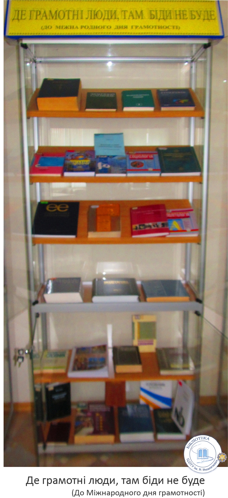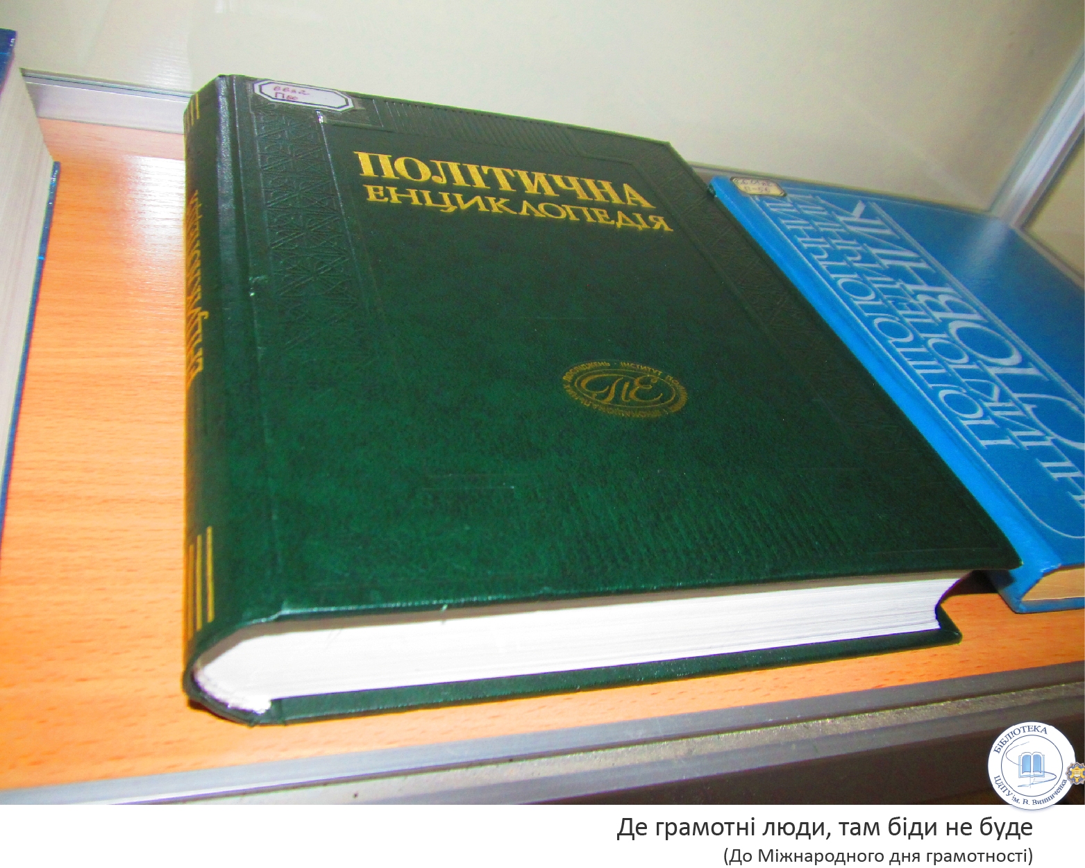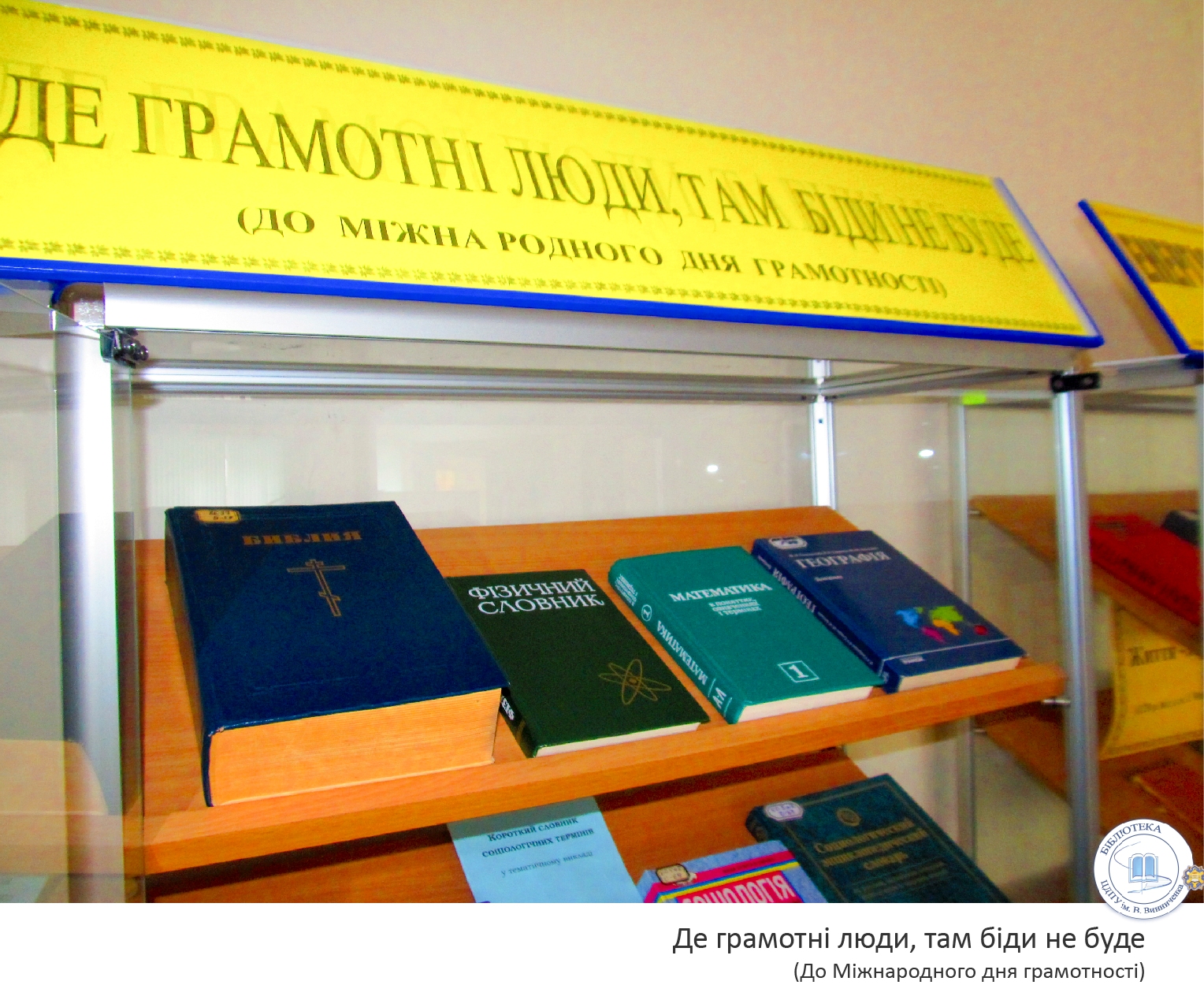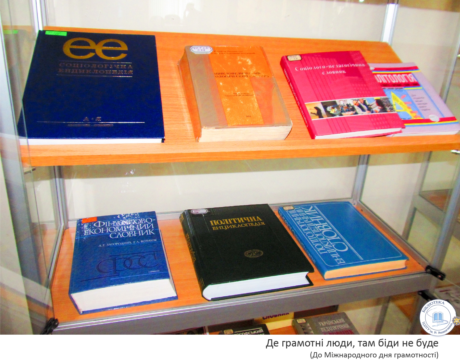 До уваги читачів читального залу філологічних дисциплін пропонується книжкова виставка, присвячена Міжнародному дню грамотності. Це свято офіційно відзначається 8 вересня Організацією Об’єднаних Націй. Запропонована виставка дає змогу відвідувачам знайти необхідні їм довідкові матеріали, до їхньої уваги підібрані словники з різних галузей знань, а для допитливих читачів, тих, чия професійна діяльність пов'язана зі спілкуванням, це є важливою умовою успіху.