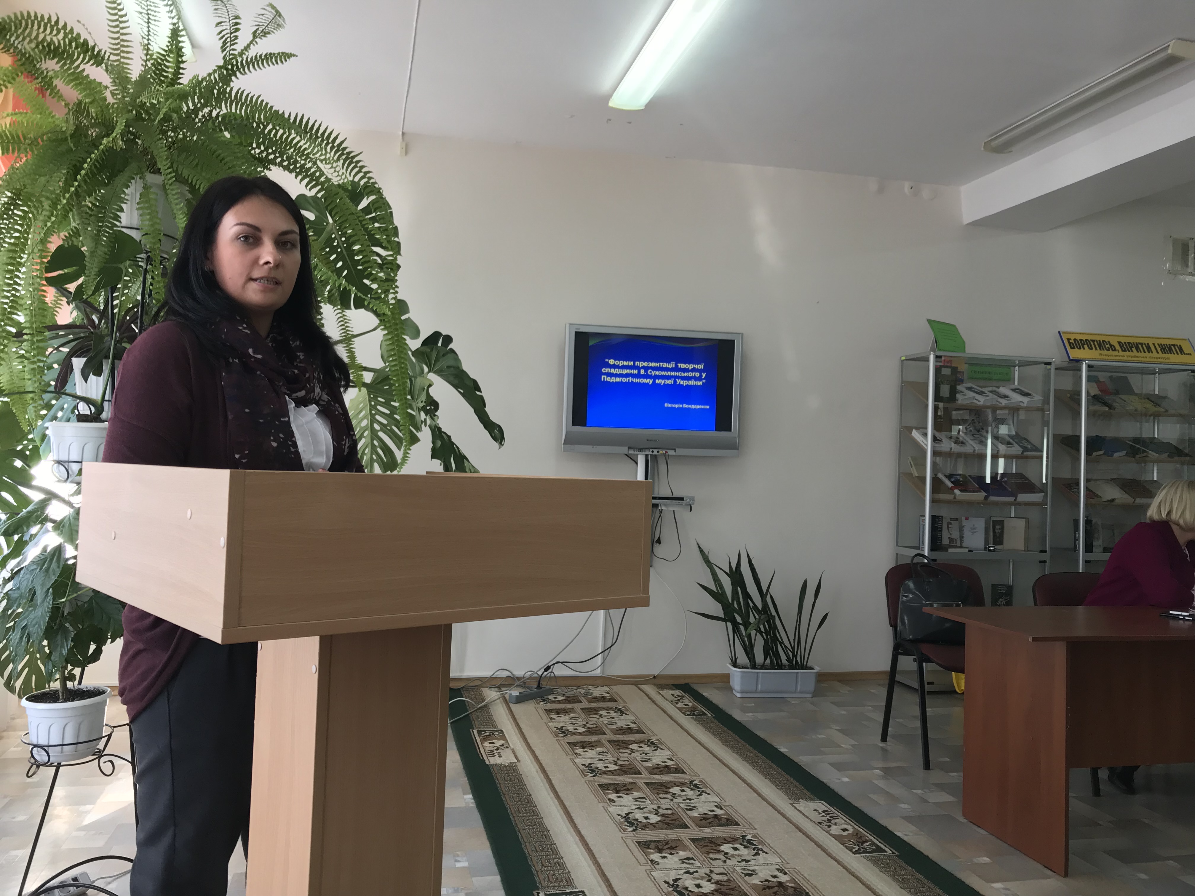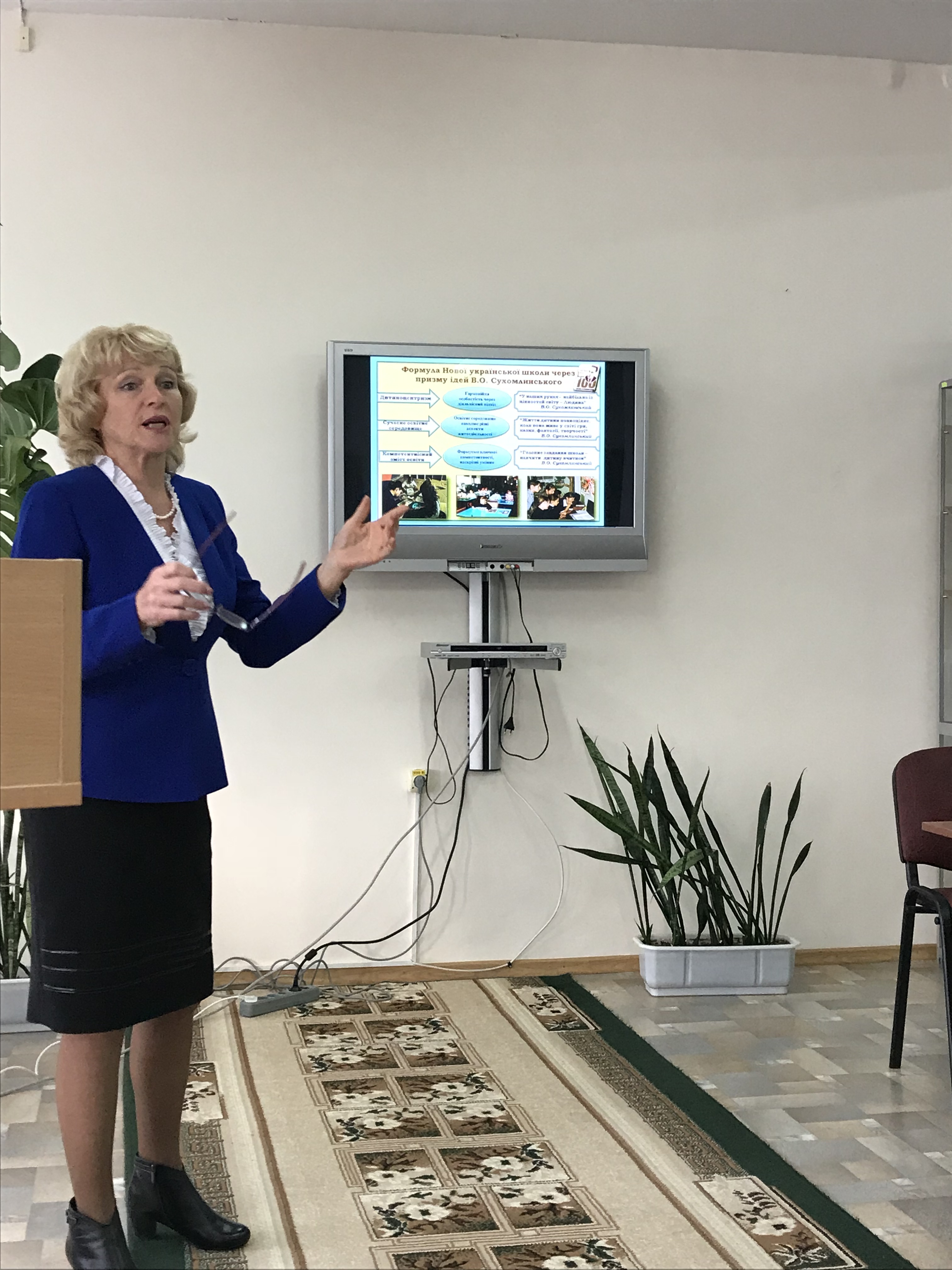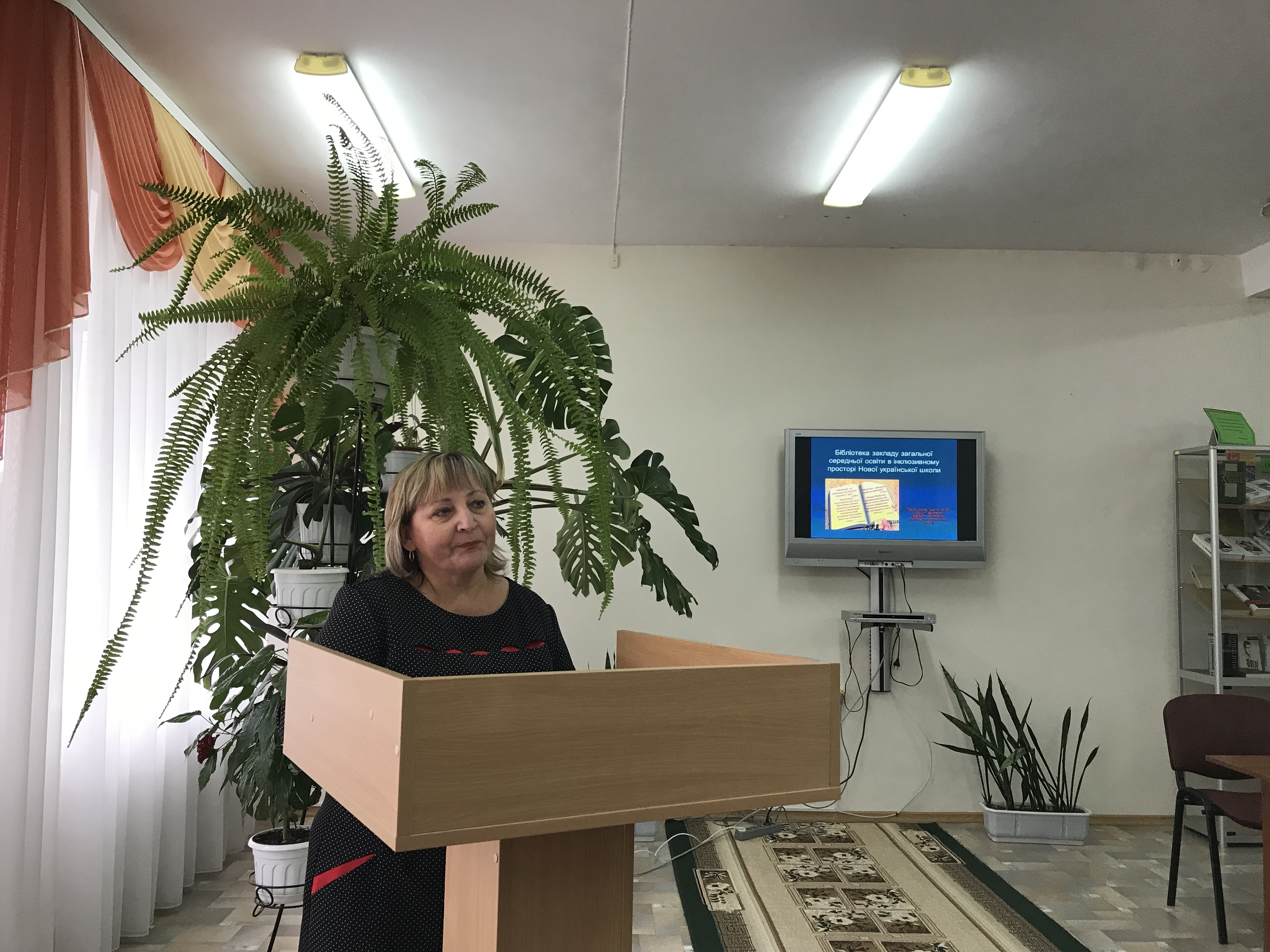 Про діяльність шкільних бібліотек у контексті педагогічної системи Василя Сухомлинського в умовах нового змісту освіти доповіла методист науково-методичної лабораторії виховної роботи та формування культури КЗ "КОІППО ім. В. Сухомлинського" Дяченко Надя іванівна та шкільні бібліотекарі: Бебих Ніна Анатоліївна, Гирба Антоніна Володимирівна, Ошедченко Оксана Олександрівна, Полтавець Світлана Владиславівна, Стеценко Галина Михайлівна.