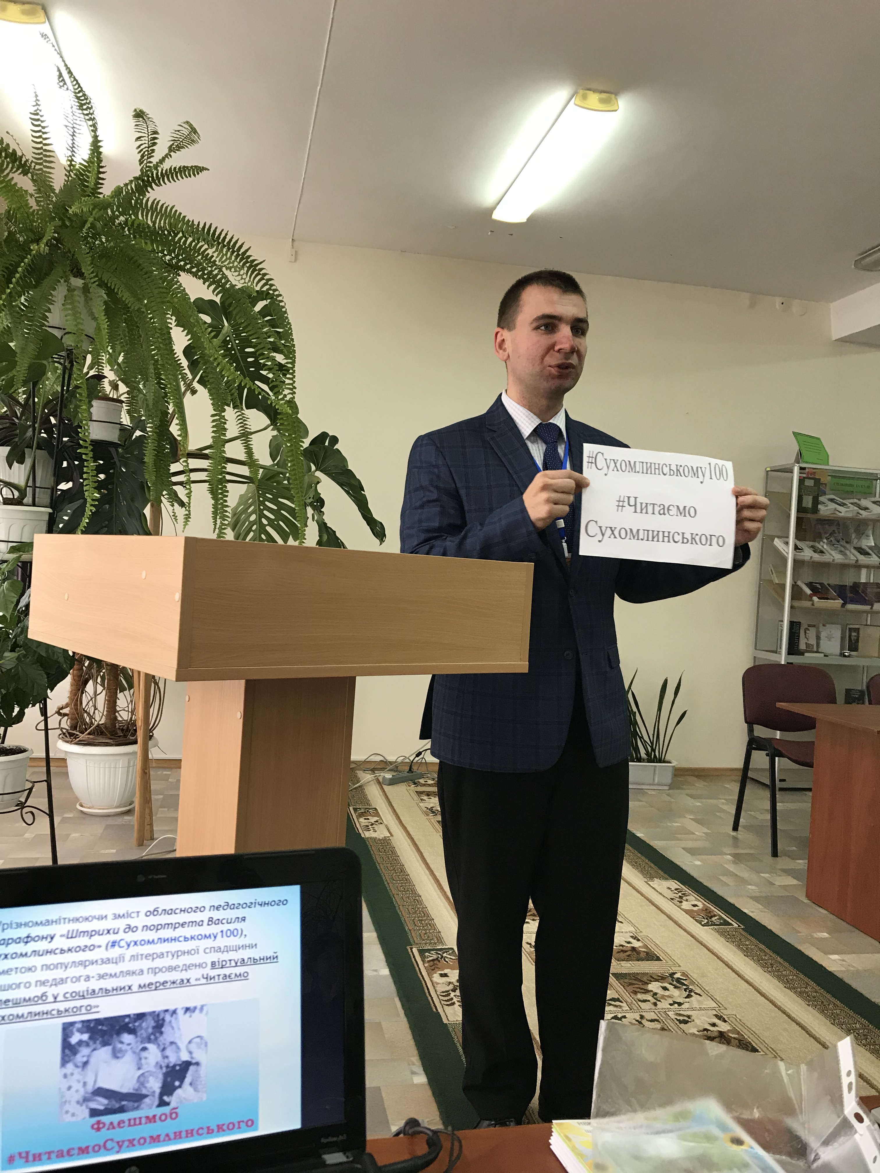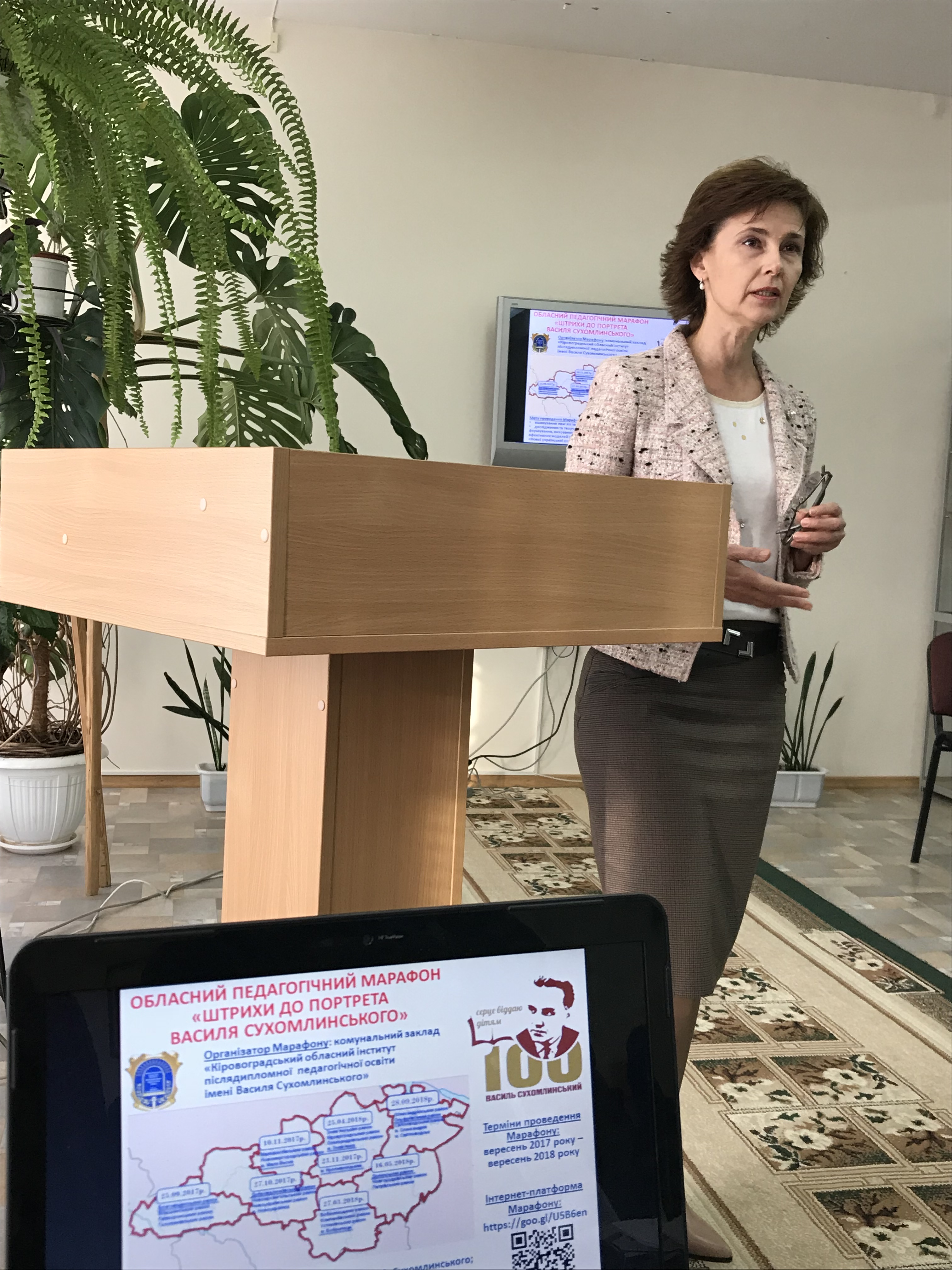 Співробітники комунального закладу "Кіровоградського обласного інституту післядипломної педагогічної освіти імені В. Сухомлинського" представили проекти творчого впровадження ідей В. Сухомлинського, а саме: атлас науково-педагогічного туризму "Дорогою до серця видатного земляка" презентувала Кендюхова Антонііна Анатоліївна, кандидат педагогічних наук, доцент кафедри педагогіки, психології та корекційної освіти; педагогічний марафон "Штрихи до портрета Василя Сухомлинського" розкрили Міцай Юлія Віталіївна, кандидат педагогічних наук, завідувач науково-методичної лабораторії виховної роботи та формування культури здоров'я та Пляка Сергій Миколайович, методист науково-методичної лабораторії виховної роботи та формування культури здоров'я. Павлюх Вікторія Вікторівна, старший викладач кафедри педагогіки, психології та корекційної освіти виступила з доповіддю "Бібліотека закладу загальної середньої освіти в інклюзивному просторі НУШ".