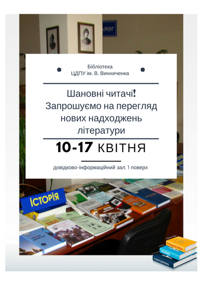 Переглянути списки літератури, яка надійшла у цей період можна на сторінці бібліотеки у розділі Нові надходження літератури.