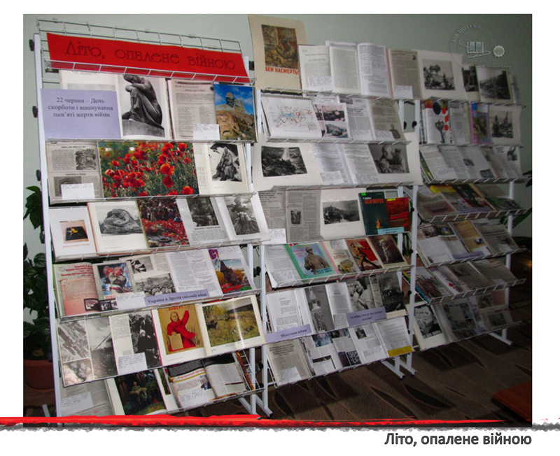 22 червня 1941 року гітлерівські війська підступно і без попередження розпочали війну. Цей день став для України Днем глибокої скорботи. Бібліотекарі універсального читального залу підготували виставку «Літо, опалене війною», яка розкриває увесь трагізм, що пережили українці.