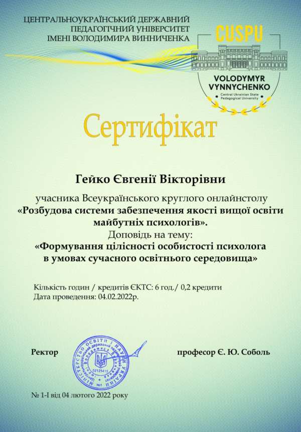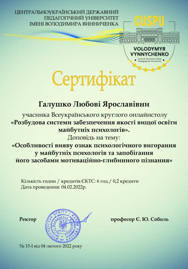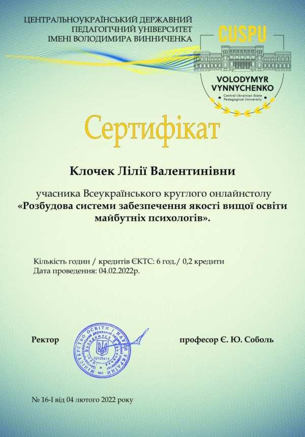 4 лютого 2022 р. в онлайн-режимі відбувся Всеукраїнський круглий стіл «Розбудова системи забезпечення якості вищої освіти майбутніх психологів», присвячений обговоренню актуальних проблем та обміну досвідом щодо розвитку й ефективного використання доробків у навчально-виховному процесі підготовки майбутніх психологів. Ініціатором його проведення виступила кафедра психології факультету педагогіки, психології та мистецтва Центральноукраїнського державного педагогічного університету імені Володимира Винниченка. Співорганізатори заходу – кафедра психології розвитку факультету психології Прикарпатського національного університету імені Василя Стефаника.