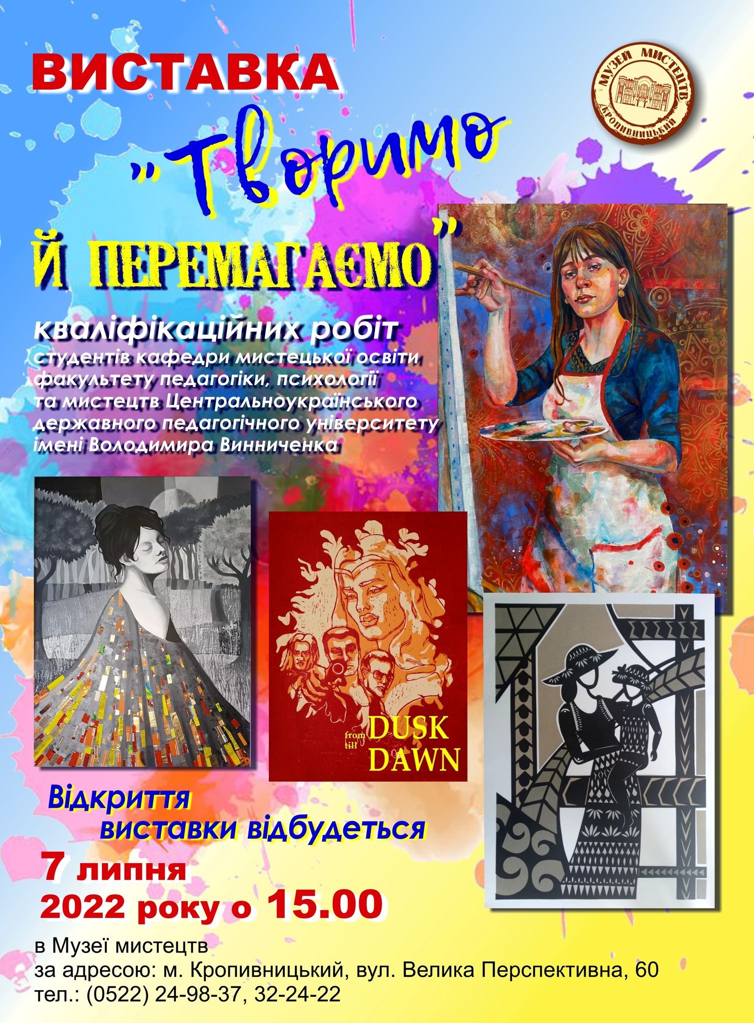 7 липня 2022 року в Музеї мистецтв відкрилася виставка «Творимо й перемагаємо!», на якій представлені кваліфікаційні роботи студентів кафедри мистецької освіти факультету педагогіки, психології та мистецтв  Центральноукраїнського державного педагогічного університету імені Володимира Винниченка.