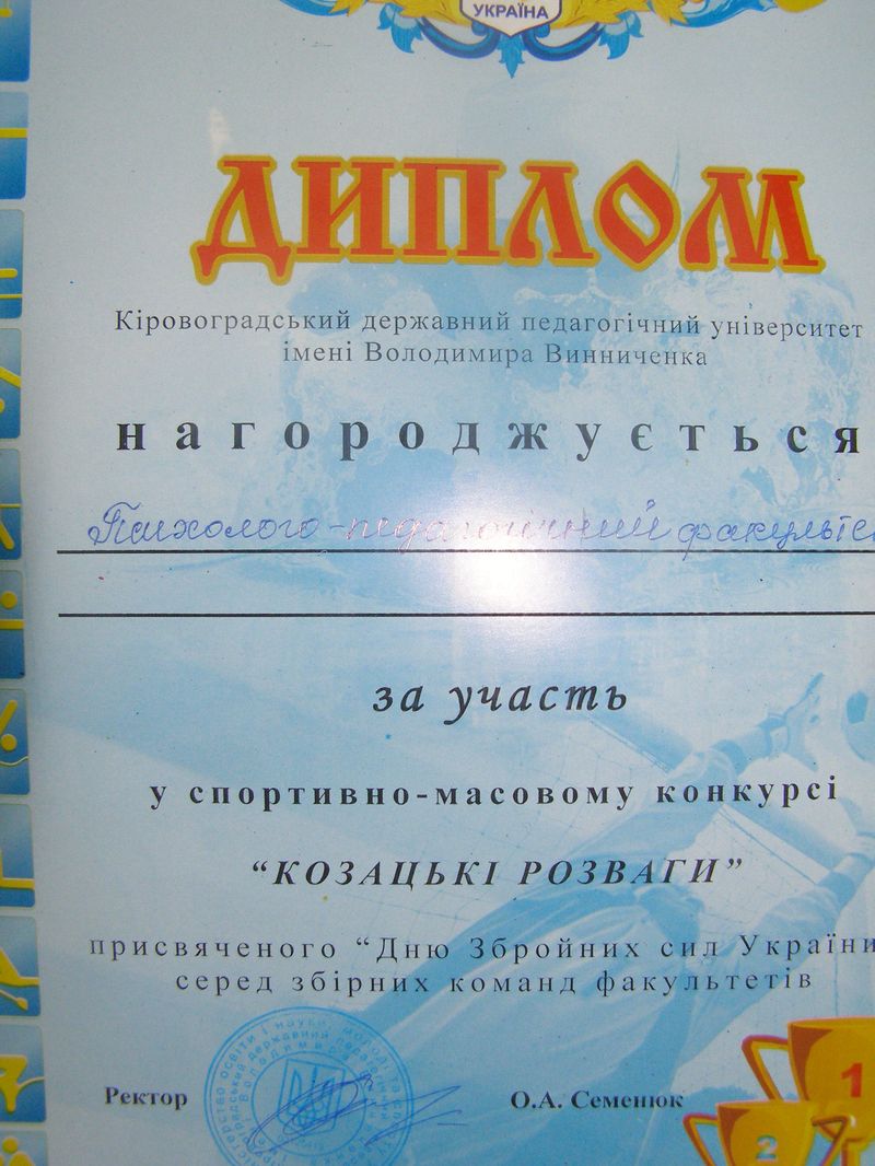 Команда студентів психолого-педагогічного факультету нагороджена за участь у спортивно-масовому конкурсі «Козацькі розваги», який проводився серед факультетів Кіровоградського державного педагогічного університету імені Володимира Винниченка 5 грудня 2011 року. Захід присвячено Дню збройних сил України.