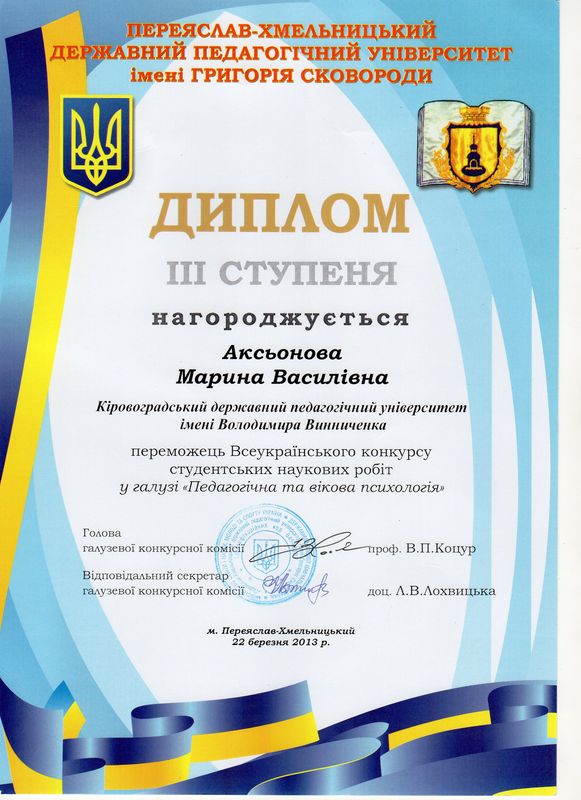 21 березня 2013 року в Переяслав-Хмельницькому державному педагогічному університеті імені Григорія Сковороди відбувся другий тур Всеукраїнського конкурсу студентських наукових робіт з природничих, технічних і гуманітарних наук з галузі педагогічна та вікова психологія. Із 370 поданих на конкурс робіт було відібрано тільки 33, серед яких і робота Аксьонової М.