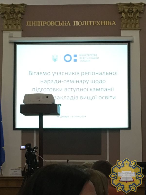 З метою обговорення актуальних питань організації і проведення прийому вступників у 2019 році до закладів вищої освіти та наукових установ, що здійснюють підготовку за освітніми ступенями бакалавра, магістра та доктора філософії всіх форм власності та сфер управління 18 січня 2019 року Міністерством освіти і науки України було проведено регіональну нараду-семінар на базі НТУ «Дніпровська політехніка» (м. Дніпро) за участю: генерального директора Директорату вищої освіти і освіти дорослих МОН України О.І. Шарова, керівника експертної групи з питань освіти дорослих та педагогічної освіти МОН України І.А. Балуби, а також представників Департаменту освіти і науки Дніпропетровської обласної адміністрації.