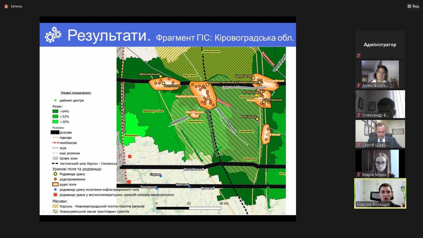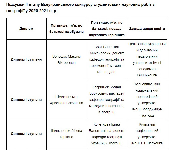 1 місце за сумою балів, набраних за оцінювання роботи, а також її захист отримав студент-магістрант спеціальності Середня освіта (Географія) Волощук Максим, який представив увазі галузевої конкурсної комісії наукову роботу на тему «Радіоеколого-геоінформаційний аналіз і оцінка радонового ризику території Кіровоградської області» (науковий керівник кандидат геолого-мінералогічних наук, доцент Вовк В.М)