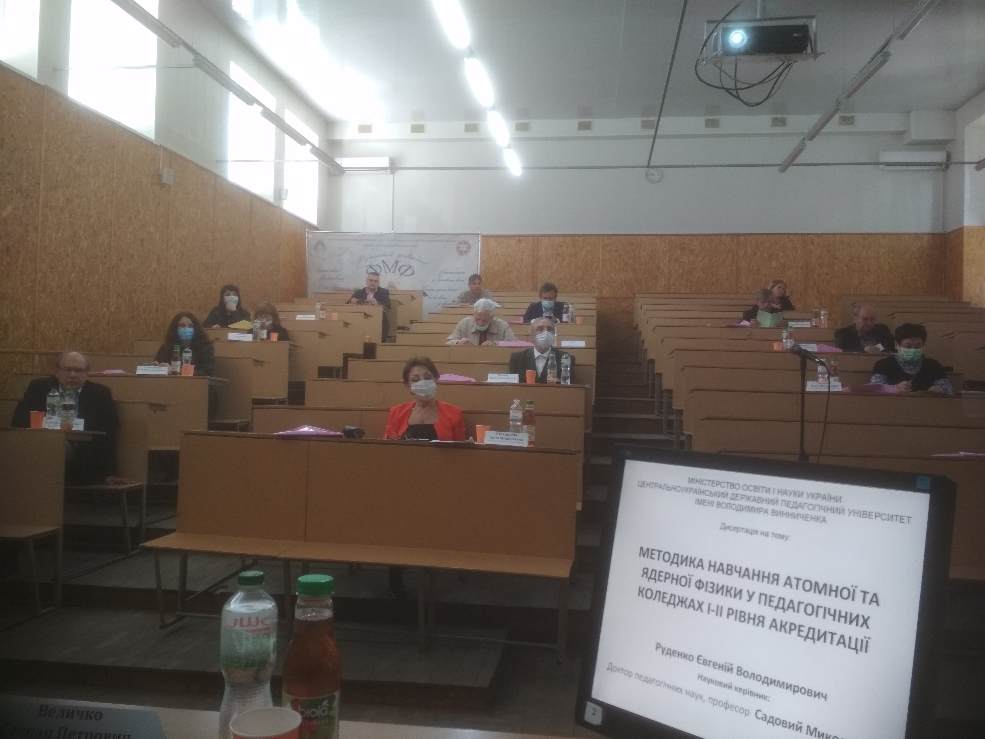14 травня 2021 року в Спеціалізованій вченій раді Д23.053.04 в Центральноукраїнському державному педагогічному університеті імені Володимира Винниченка відбувся захист кандидатської дисертації Руденка Євгенія Володимировича на тему «Методика навчання атомної та ядерної фізики у педагогічних коледжах І-ІІ рівня акредитації» зі спеціальності 13.00.02 – теорія та методика навчання (фізика).