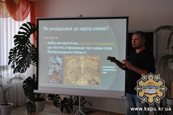 3 жовтня 2014 року в Науковій бібліотеці КДПУ імені В.Винниченка відбулася презентація карти-схеми «Кіровоградська область. Ліси: розташування, обриси, назви». На презентації були присутні представники Кіровоградської обласної універсальної наукової бібліотеки ім. Д.І. Чижевського, Національної спілки краєзнавців України, державного архіву Кірвоградської області, представники Кіровоградської обласної федерації спортивного туризму, Кіровоградського обласного краєзнавчого музею, КОІППО імені Василя Сухомлинського, а також викладачі та студенти КДПУ імені В.Винниченка.