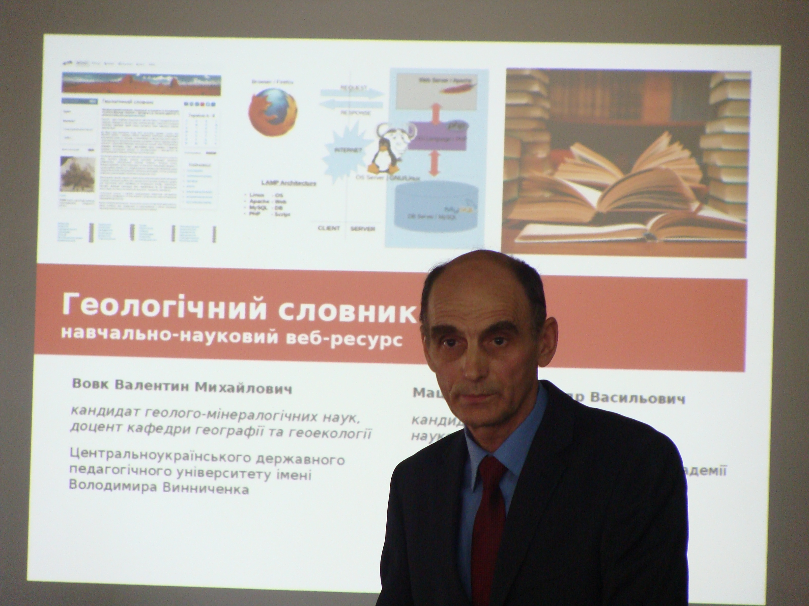 У своїй промові Валентин Михайлович ознайомив присутніх із історією і основними етапами створення навчально-наукового веб-ресурсу, про особливості його структурування і можливості використання студентами, учителями, викладачами, науковцями. Основними принципами під час змістовного наповнення "Геологічного словника" були простота викладу, повнота охоплення сучасної геологічної номенклатури, якісний ілюстративний супровід тлумачень основних понять. Використовувались сучасні літературні та електронні інформаційні джерела. Словник налічує понад 3000 геологічних термінів і понять, які супроводжуються значною кількістю ілюстрацій (понад 1200). У процесі відбору термінів та їх тлумачення Валентин Михайлович спирався на колективний досвід спеціалістів-геологів, відображений у численних монографіях, статтях, словниках, довідниках, веб-ресурсах, нормативних документах, а також на сучасні тенденції розвитку геологічної термінології.