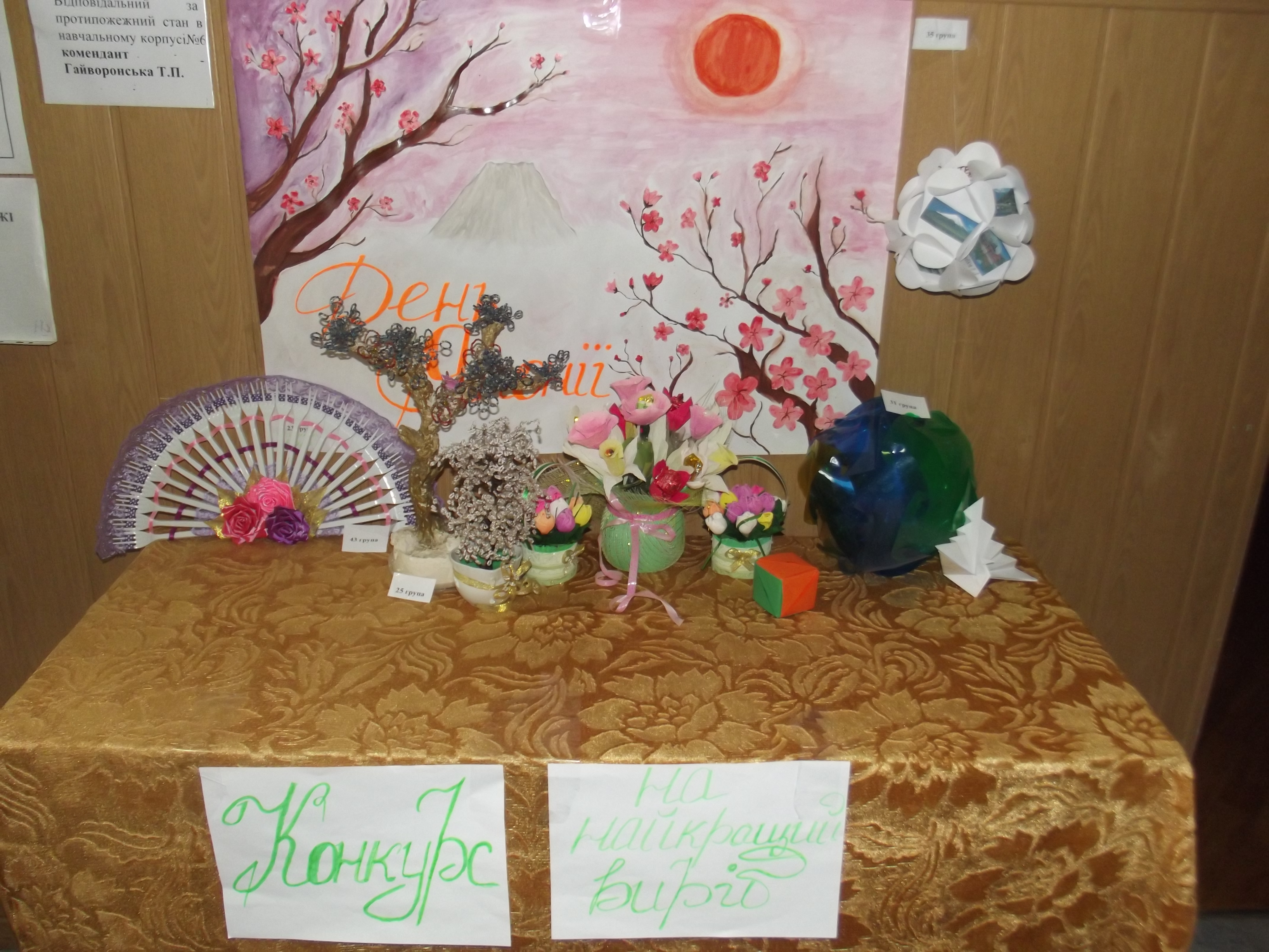 Також в ході свята пройшла виставка кращого виробу в стилі японської культури, всі призери отримали цікаві і ригінальні подарунки за своє уміння та старання. Головним смаколиком на святі стала традиційна японська страва – суші. Свято проходило дуже весело, адже деякі студенти були одягнені в костюми самураїв, що надавало святкуванню ще більше японського духу. Оформили та провели свято студенти: Начоса Наталія, Назаренко Данило, Софія Шумовська, Язан Анастасія, Власенко Альона, Лєвша Лілія та Кулеба Тетяна.