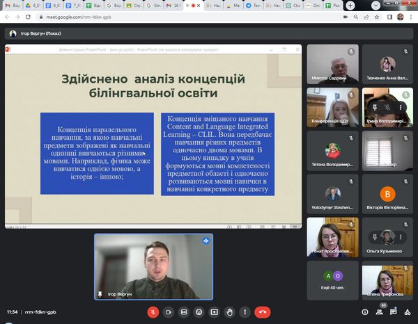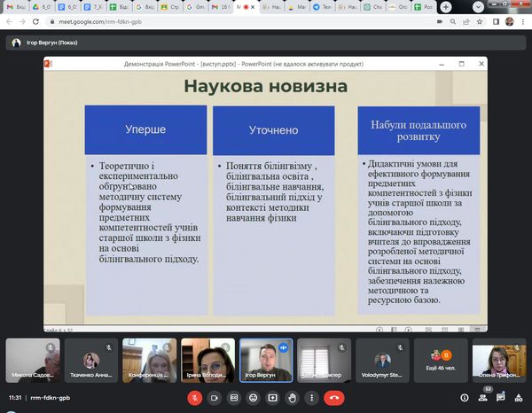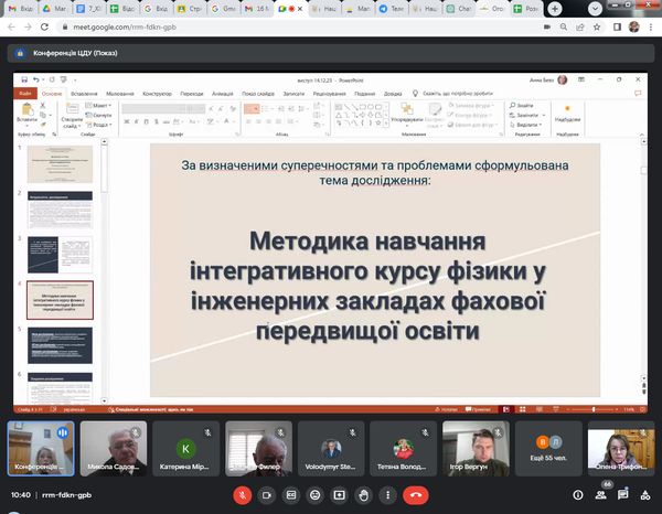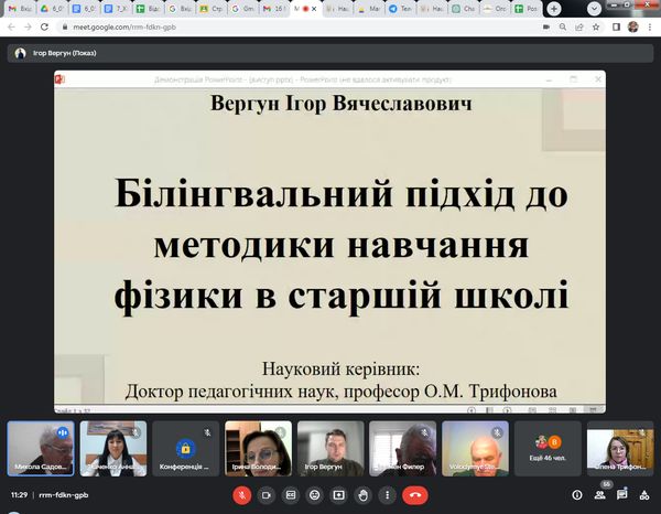 Із ґрунтовним аналізом дисертаційних досліджень виступили Анна Бевз на тему «Методика навчання інтегративного курсу фізики у інженерних закладах фахової передвищої освіти» (наук.керівник: д.пед.н., проф. Микола Садовий) та Ігор Вергун на тему «Білінгвальний підхід до методики навчання фізики в старшій школі» (наук.керівник: д.пед.н., проф. Олена Трифонова). Дисертаційні дослідження виконані на кафедрі природничих наук і методик їхнього навчання Центральноукраїнського державного університету імені Володимира Винниченка.