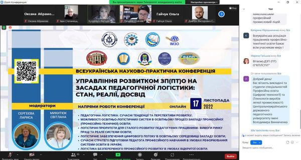 Завдяки давнім творчим взаємозв’язкам кафедри технологічної та професійної освіти Центральноукраїнського державного університету імені Володимира Винниченка з кафедрою професійної і вищої освіти Центрального інституту післядипломної освіти Державного закладу вищої освіти «Університет менеджменту освіти» НАПН України (Меморандум про взаєморозуміння та взаємодію у фундаментальних та прикладних наукових дослідженнях) наш університет став співорганізатором Всеукраїнської науково-практичної конференції «Управління розвитком ЗП(ПТ)О на засадах педагогічної логістики: стан, реалії, досвід», яка відбулася у онлайн форматі 17 листопада 2022 р. на базі Державного закладу вищої освіти «Університет менеджменту освіти» Національної академії педагогічних наук України, м. Київ (наказ МОН України від 21.05.2019 р. № 693).