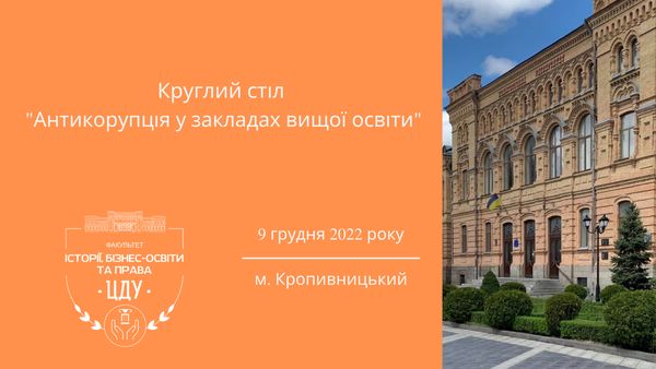 Щороку 9 грудня в Центральноукраїнському державному університеті імені Володимира Винниченка проводиться круглий стіл, присвячений Міжнародному дню запобігання корупції. Тема цьогорічного заходу: «Антикорупція у закладах вищої освіти», організатором якого є уповноважена особа з питань запобігання та виявлення корупції, доцент кафедри права та правоохоронної діяльності, кандидат юридичних наук, доцент Окопник О.М., співорганізатором є Юридична клініка «Аrtium De Lex» ЦДУ імені Володимира Винниченка.