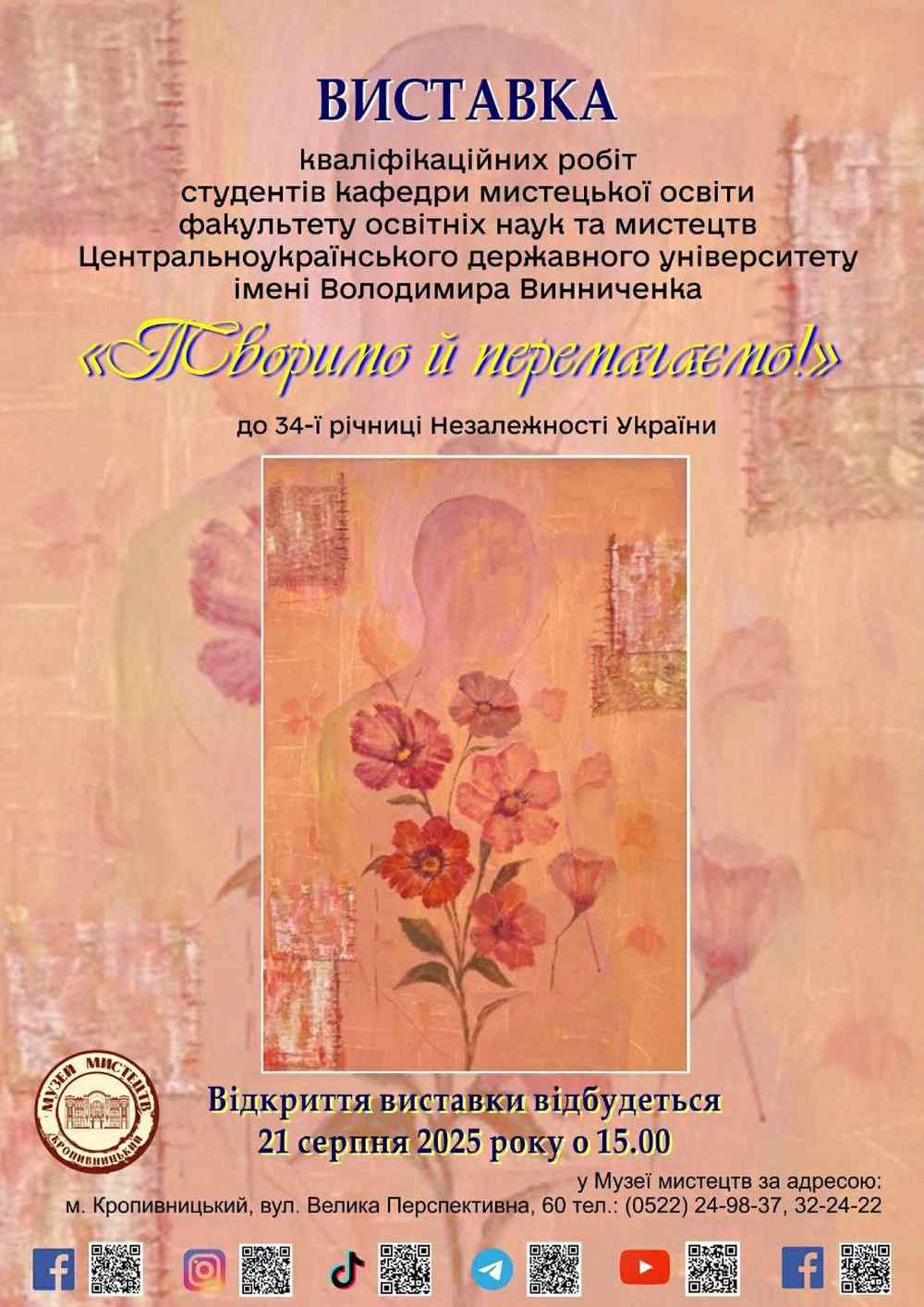 21 серпня 2025 року в Музеї мистецтв відбулося відкриття виставки кваліфікаційних робіт студентів кафедри мистецької освіти факультету освітніх наук та мистецтв Центральноукраїнського державного університету імені Володимира Винниченка «Творимо й перемагаємо!» до 34-ї річниці Незалежності України. В умовах повномасштабної російсько-української війни та незмінних намагань ворога знищити нас як державу, націю та етнокультурний феномен, День Незалежності України набуває особливо важливого значення, оскільки це свято символізує довготривалу естафету державотворчих процесів в Україні і спрямоване на формування української національної ідентичності та консолідацію українського суспільства, зокрема в межах загальновідомого концептуального гасла «Об’єднаємо Україну мистецтвом!».