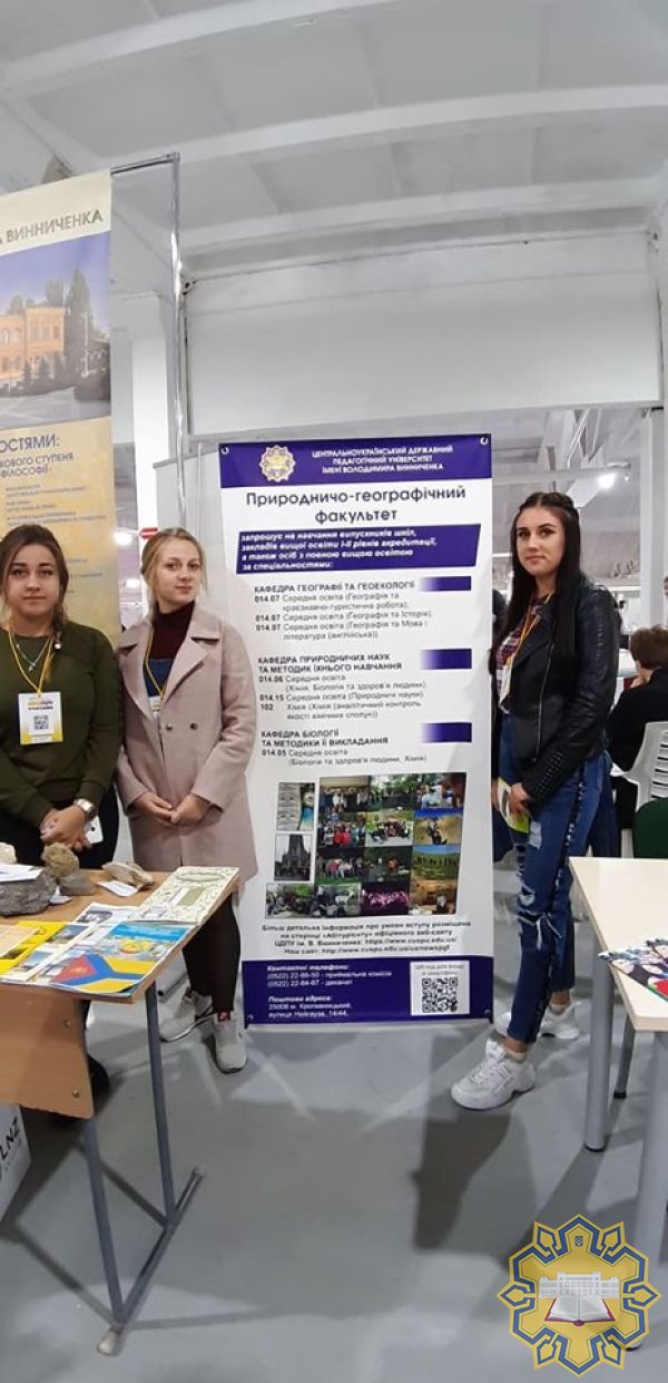 У рамках локації «Освітній ярмарок», яка проводилась для багатьох закладів вищої освіти, що розміщувалась на другому поверсі реконструйованого закритого виставкового павільйону, наш університет представив цікаву експозицію, на площадці якої протягом трьох днів були представлені різноманітні вироби з дерева, бісеру, вишиванки, вироби в техніці «patchwork», лялькові іграшки, колекція мінералів, цікаві хімічні досліди та ін., що викликали жвавий інтерес відвідувачів різних вікових груп.