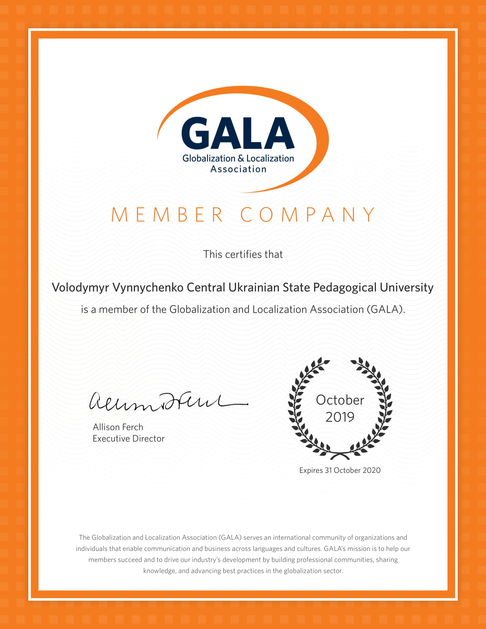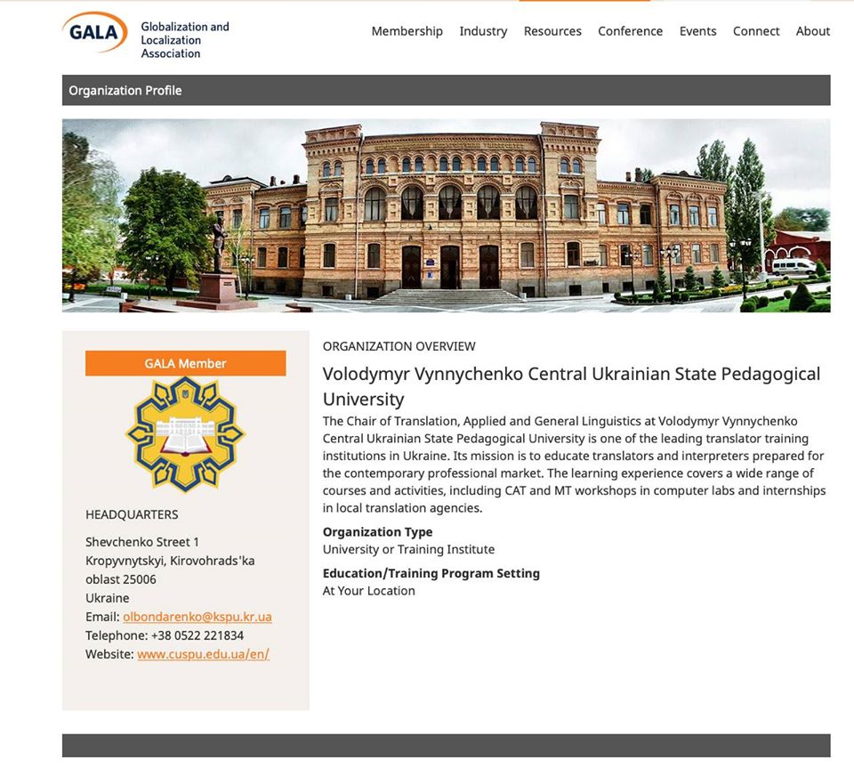 Щиро вітаємо кафедру перекладу, прикладної та загальної лінгвістики з офіційним членством в одній з найавторитетніших професійних асоціацій перекладацьких та локалізаційних компаній «The Globalization and Localization Association (GALA)».