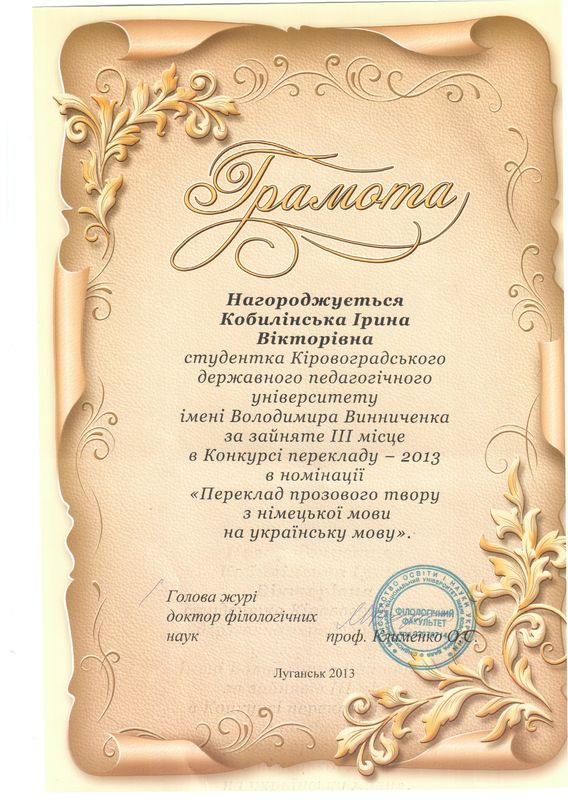 ІІІ місце в номінації «Переклад німецького прозового тексту українському мовою» цього року здобула студентка факультету іноземних мов напряму підготовки 6.020303 Філологія (Переклад) Ірина Кобилінська. Її інтерпретація фрагменту оповідання німецького письменника та драматурга Ґеорґа Бюхнера (1813 – 1837) «Ленц» (Lenz, 1835) привабила до себе увагу шанованого журі, до складу якого ввійшли кращі філологи провідного луганського вишу, і матеріалізувалася у формі грамоти для переможниці, а також цілком реальної перспективи побачити своє творіння надрукованим на сторінках збірки, до якої ввійдуть усі твори лауреатів чудового конкурсу.