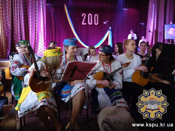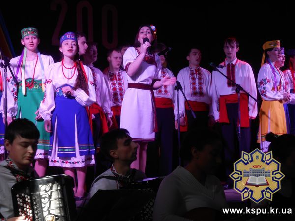 Апогеєм святкувань став концерт за участю окремих студентів з різних факультетів, колективів мистецького факультету та молодіжного центру. Лунали і сильні рядки поезії, і пісні, й мелодії. Декламували вірші лауреати обласного конкурсу Валерія Руссу та Олександра Крикун і володарка гран-прі конкурсу Ксенія Ноговіцина. Зачарував своєю грою на скрипці студент мистецького факультету Олександр Шерстюк. Одним цілим музичним організмом був оркестр народних інструментів «Степові зорі» та народний хор «Дивоспів» (керівники З.М. Стукаленко та Н.Т. Мєдвєдєва). Затамувавши подих глядачі слухали музичні твори написані на слова Т. Шевченка, а саме: «Зоря моя вечірняя», солісти Тетяна Михайліна і Тетяна Кондратенко, «Утоптала стежечку» солісти Надія Гевель та Олена Табак. Особливо публіка вподобала хоровий твір написаний композитором В. Захарченком «Вітре буйний», де заспівувала солістка Національного заслуженого академічного народного хору України імені Г. Верьовки Оксана Сергєєва. І дійсно, їх спів – просто диво. А твір «Реве та стогне Дніпр широкий» у виконанні того ж хору «Дивоспів» та оркестру «Степові зорі» глядачі слухали стоячи.