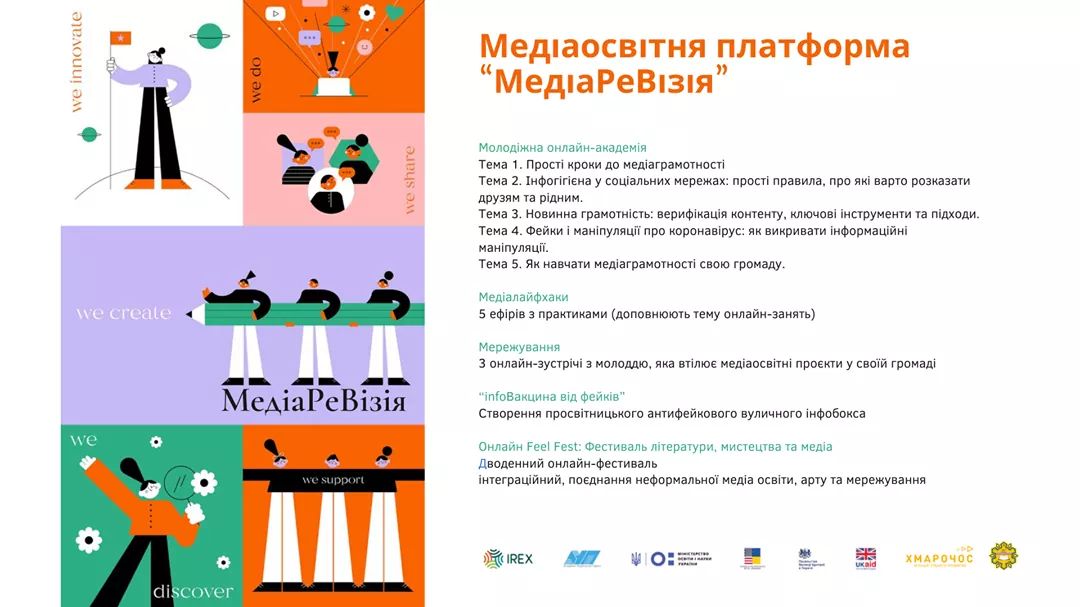 На молодь чекають: захоплююче навчання в Молодіжній онлайн-академії “МедіаРевізія”», можливість стати тренерами з медіаграмотності та прокачати свою громаду, мережування з молоддю з громад України, які створюють медійні та медіаосвітні проєкти, медіалайфхаки від практиків, Online Feel Fest: Фестиваль літератури, мистецтва та медіа.
