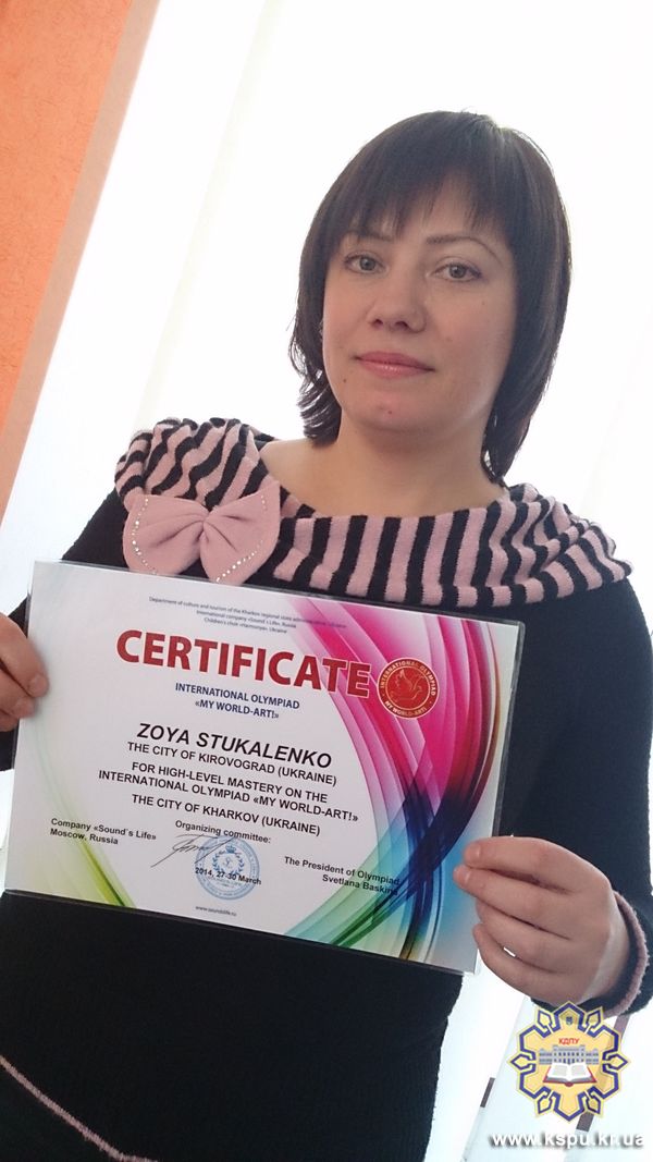 Сертифікати за якісну підготовку студентів до конкурсних випробувань тависокохудожню інтерпретацію музичних творівотримали викладачі кафедри музично-теоретичних та інструментальних дисциплін: кандидат педагогічних наук, доцент Н. В. Свещинська, кандидат педагогічних наук, старший викладач С. В. Грозан та викладач З. М. Стукаленко.