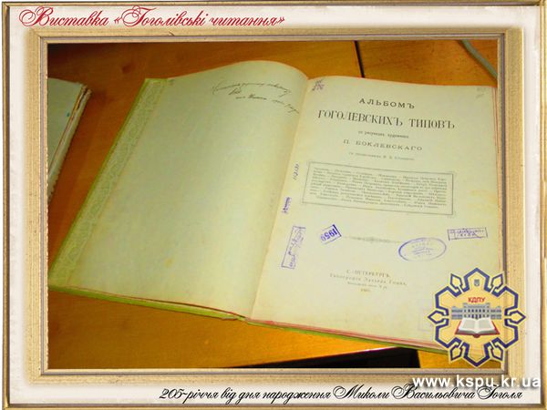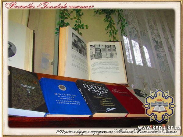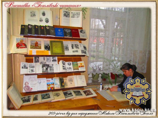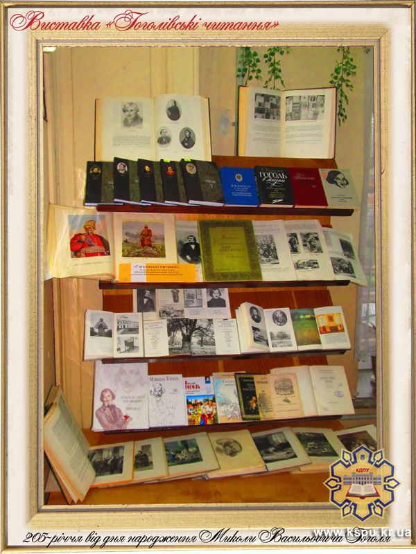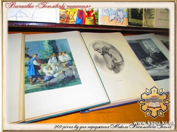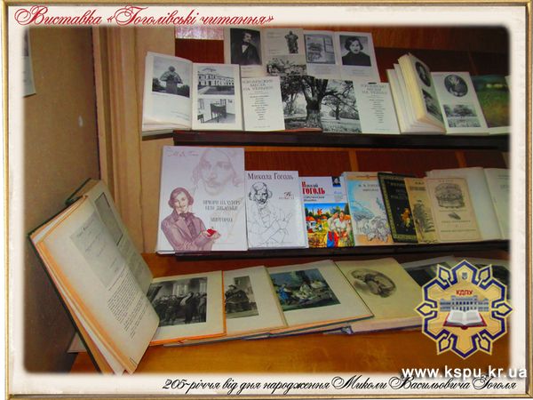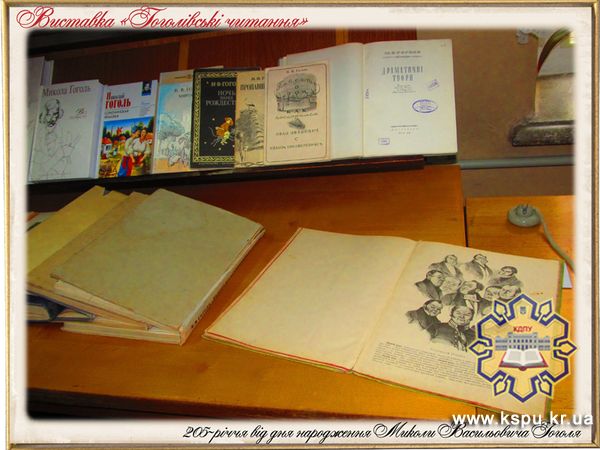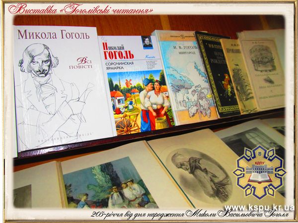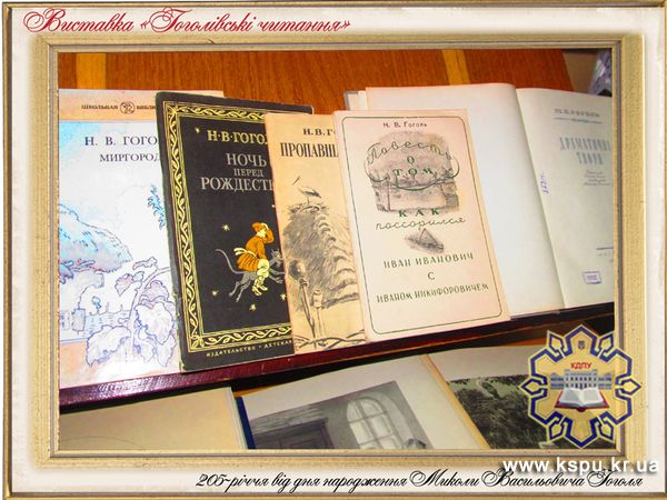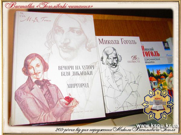 Виставка презентує нові видання: зібрання творів письменника у семи томах, «Всі повісті», «Вечори на хуторі біля Диканьки», «Сорочинская ярмарка». Увазі користувачів запропоновані: «Ночь перед Рождеством», «Пропавшая грамота», «Как поссорился Иван Иванович с Иваном Никифоровичем», «Миргород» та багато інших. Виставка проілюстрована підбіркою фотоматеріалів про життя і творчість талановитого письменника.